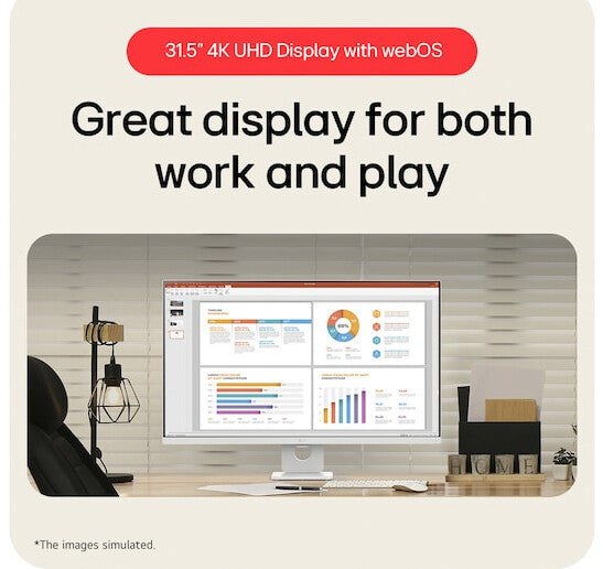 Adapt to any task or environment with numerous possibilities. Powered by webOS, you can manage home office tasks without a PC and enjoy a wealth of content, seamlessly balancing work and entertainment. Enjoy a large 32-inch display, and stunning 4K picture quality in your own space.