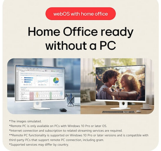 webOS enables you to remotely access your PC and Cloud PC via Remote PC. This functionality lets you utilise various home office services, including video conferencing and cloud-based applications, all without a PC.