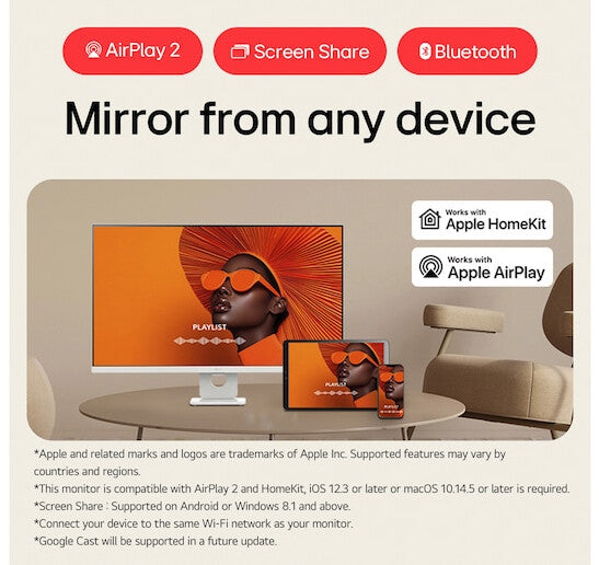 Effortlessly share content from your smart device to our monitor with AirPlay 2* (for Apple devices), Screen Share** (for Android devices). Connect instantly and enjoy a seamless viewing and audio experience on a larger screen with just a few taps.