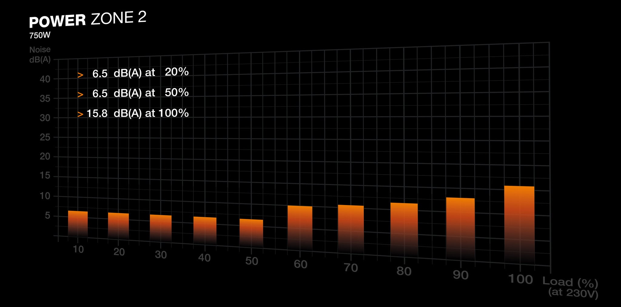 A large Pure Wings 3 140mm fan is keeping Power Zone 2 750W cool. While under low load, the fan turns off completely until its services are needed again for more demanding operations. This post-ventilation requires a short cooldown period of 2-5 minutes to avoid frequent and annoying starts and stops of the fan. Combined with the large fan for active cooling, this power supply is exceptionally silent in all load scenarios.