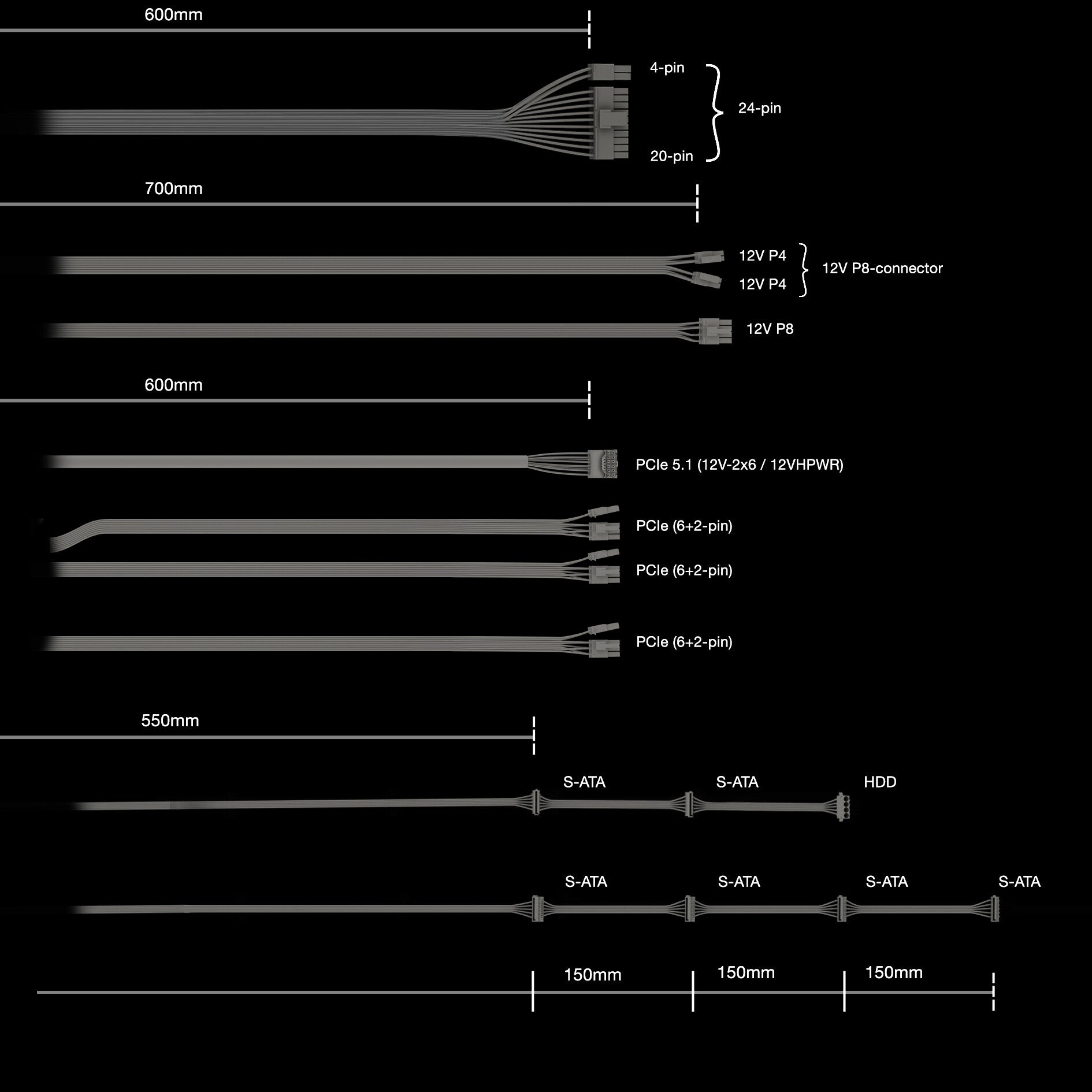 Power Zone 2 750W is an ATX 3.1 PSU and comes with both native integration of the 12V-2x6 connector for next-generation PCIe 5.1 graphics cards, and 3 PCIe 6+2-pin connectors for support of current-gen GPUs. A 90° angled 12V-2x6 connector in the scope of delivery leaves no doubt that this PSU is here to stay. All of this makes Power Zone 2 750W extremely versatile and the perfect choice for powerful systems of today and the ones to come.