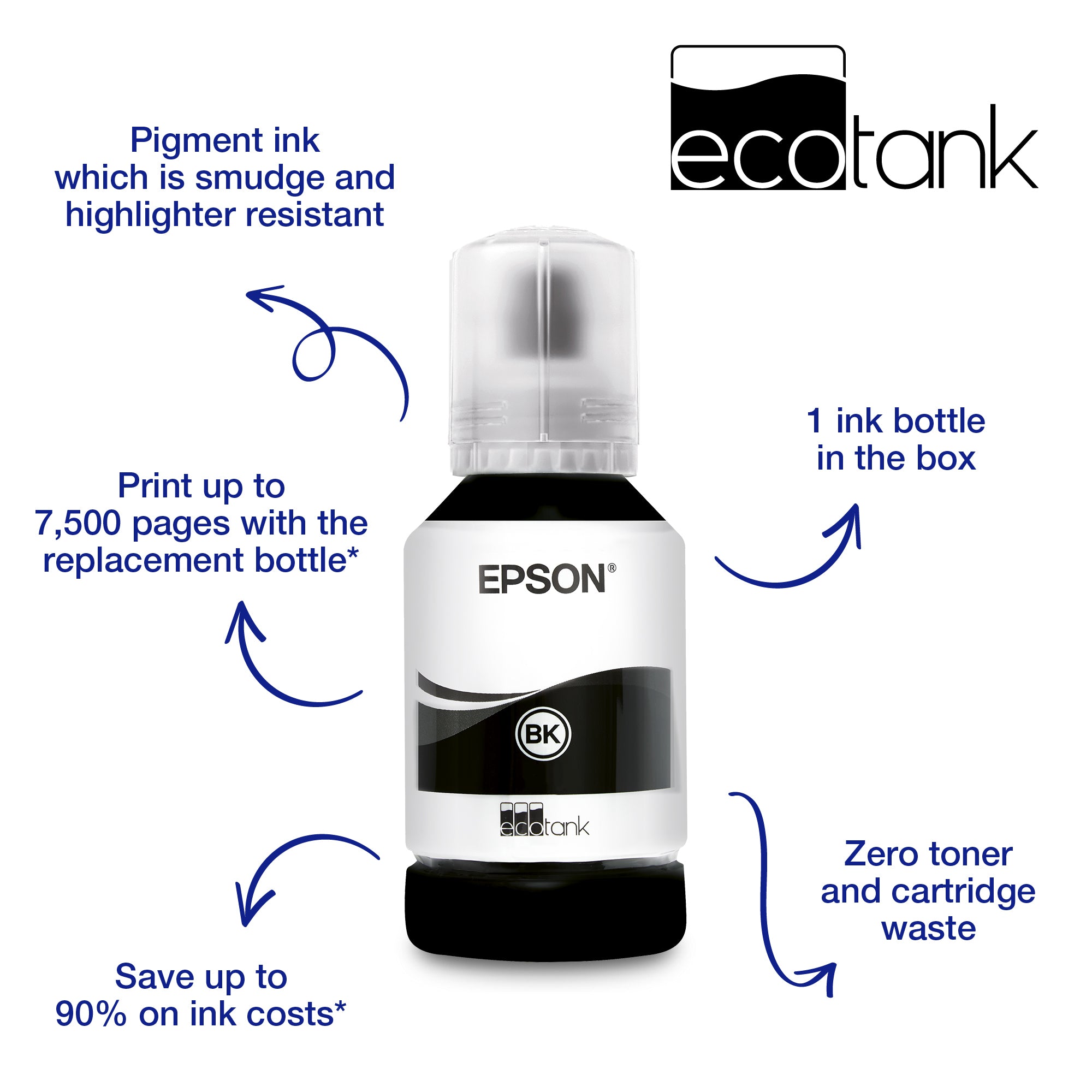 The EcoTank 113 ink series features all pigment ink for smudge-free and highlighter-resistant prints. With this reliable and high-quality ink, you can be sure it will deliver great prints with clear text. From one set of replacement ink, you can produce up to 7500 pages in black*.