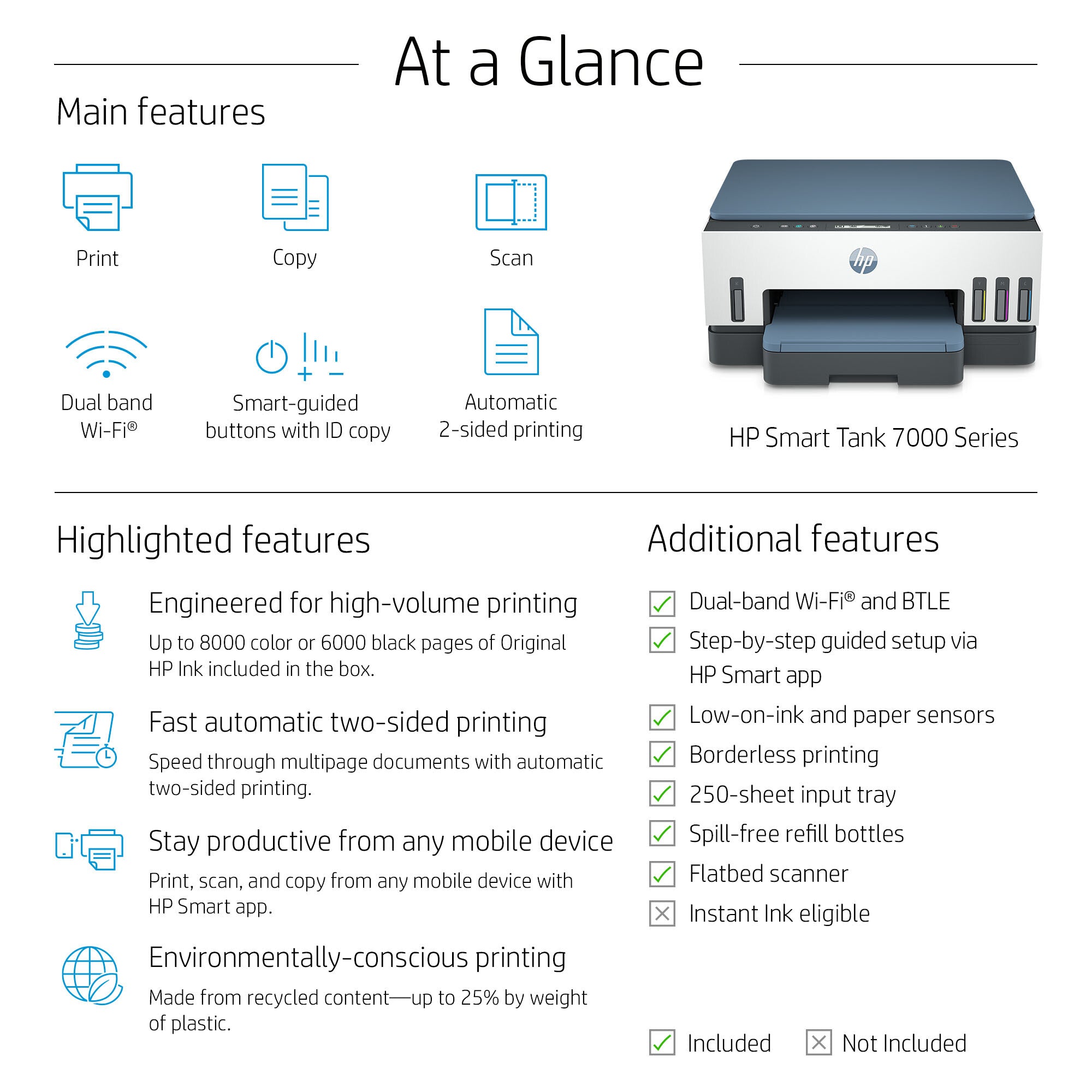 | Box contents | HP Smart Tank 7008 All-in-One; 2 x HP 32XL Black Original Ink Bottle; HP 31 Cyan Original Ink Bottle; HP 31 Magenta Original Ink Bottle; HP 31 Yellow Original Ink Bottle; HP Black Printhead; HP Tri-color Printhead; Ink caution flyer; Repacking flyer; Setup guide; Reference guide; Regulatory flyer; PT flyer; RoH-EAC Regulatory flyer; Power cord; Extended warranty flyer. For more information about fill and yield, see http://www.hp.com/go/learnaboutsupplies |
