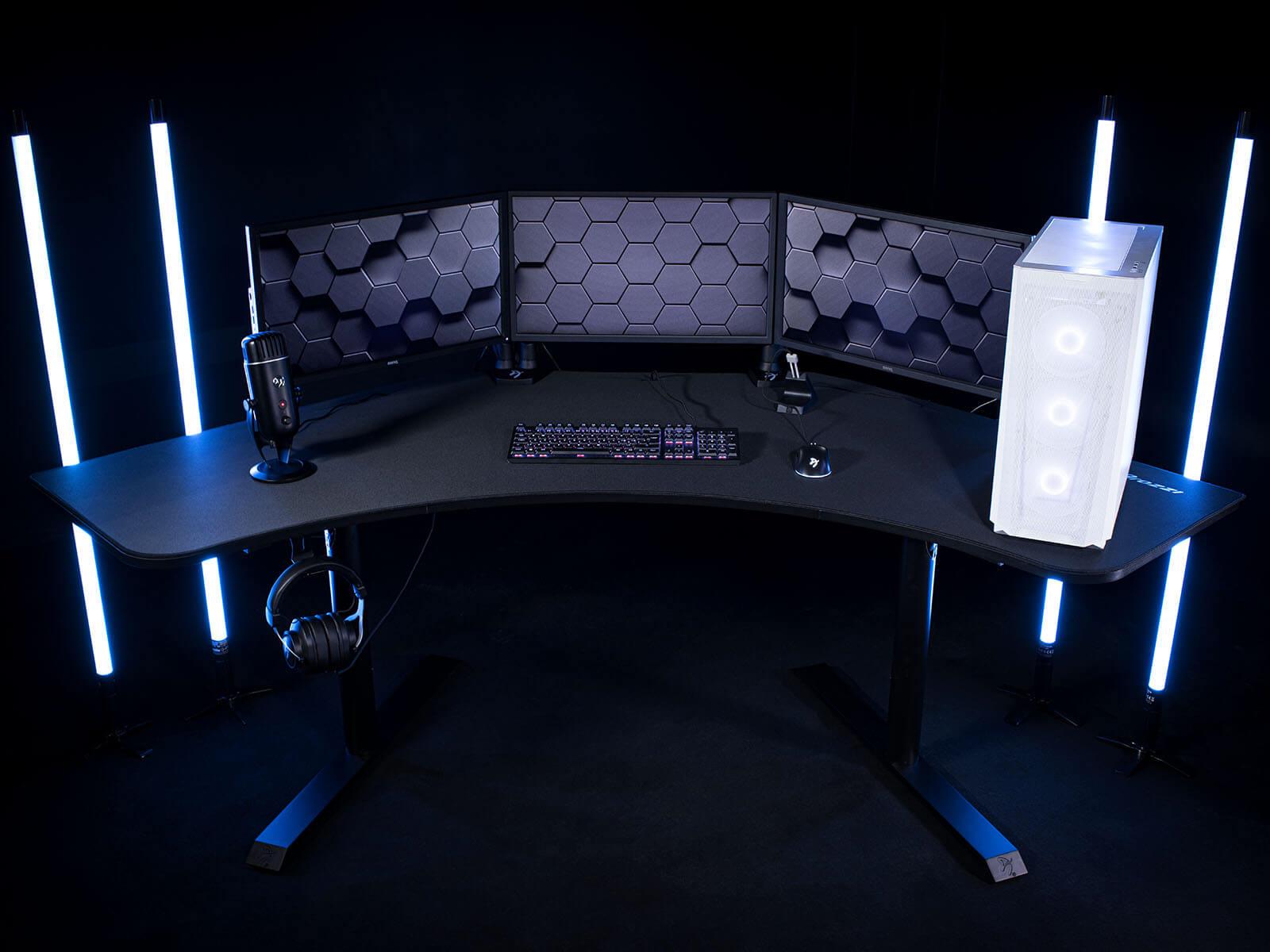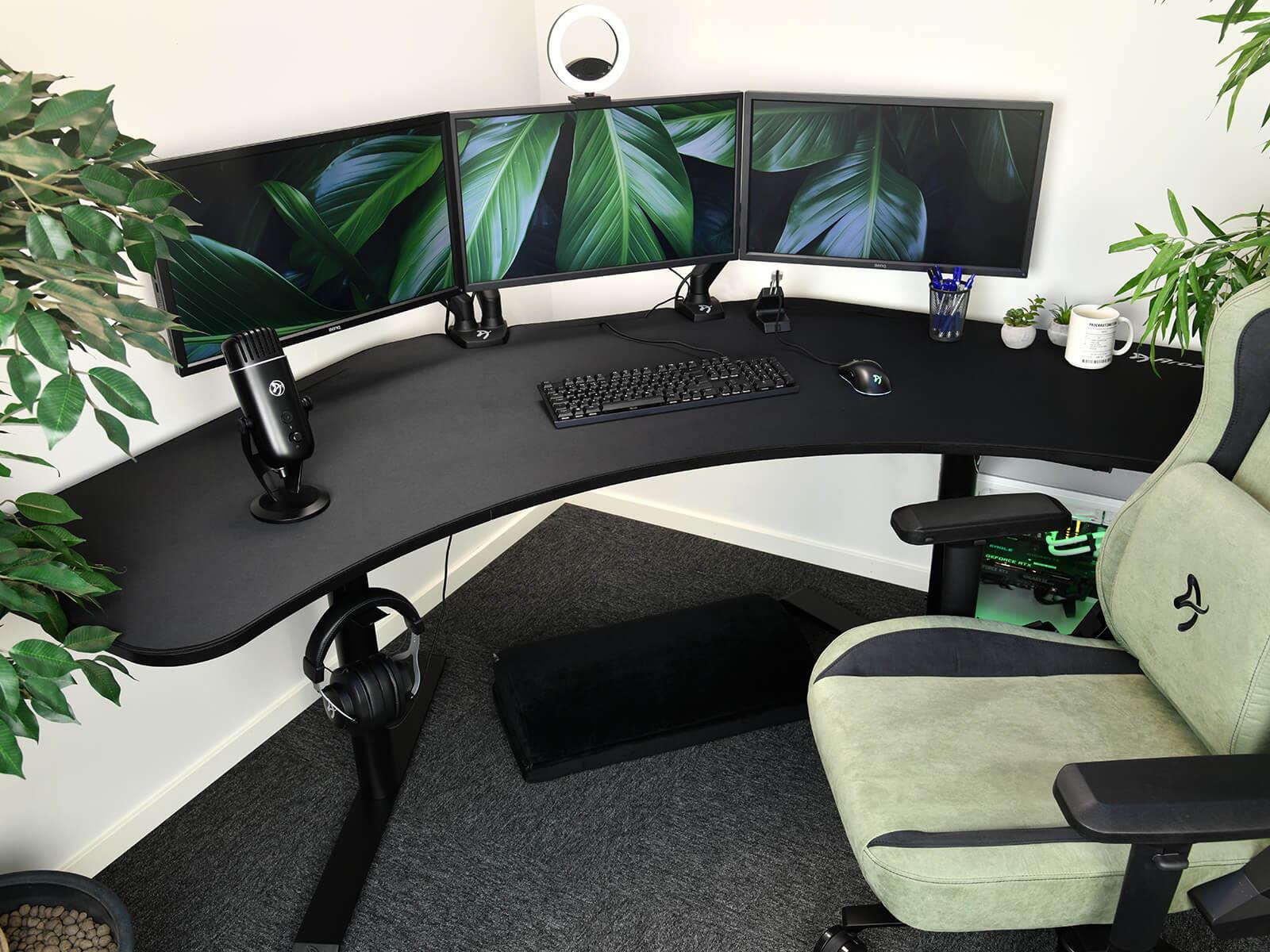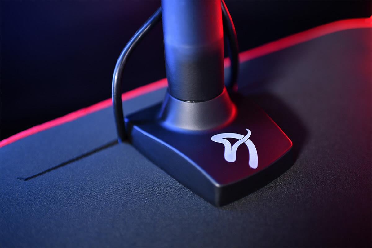 The entire surface of the desk is covered with a liquid repellent, microfiber mousepad. The desk features three strategically positioned cutouts, used for attaching your monitors or guiding cables neatly to a mesh basket snugly secured beneath the desk.