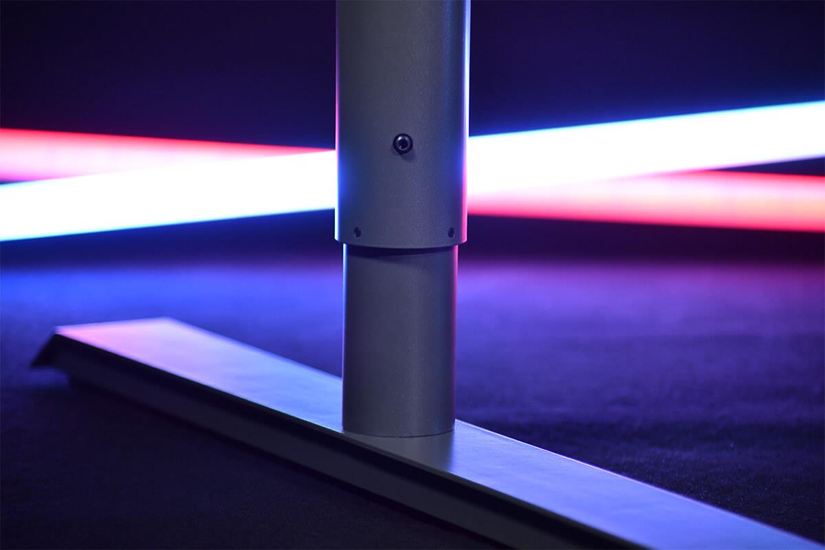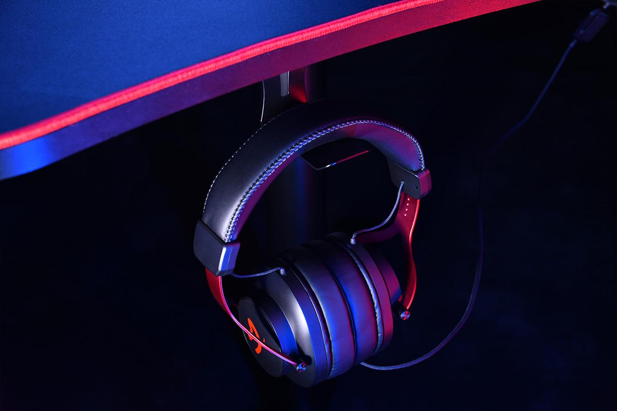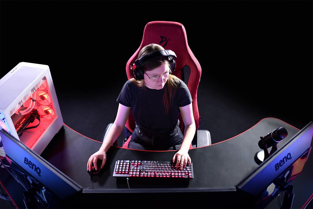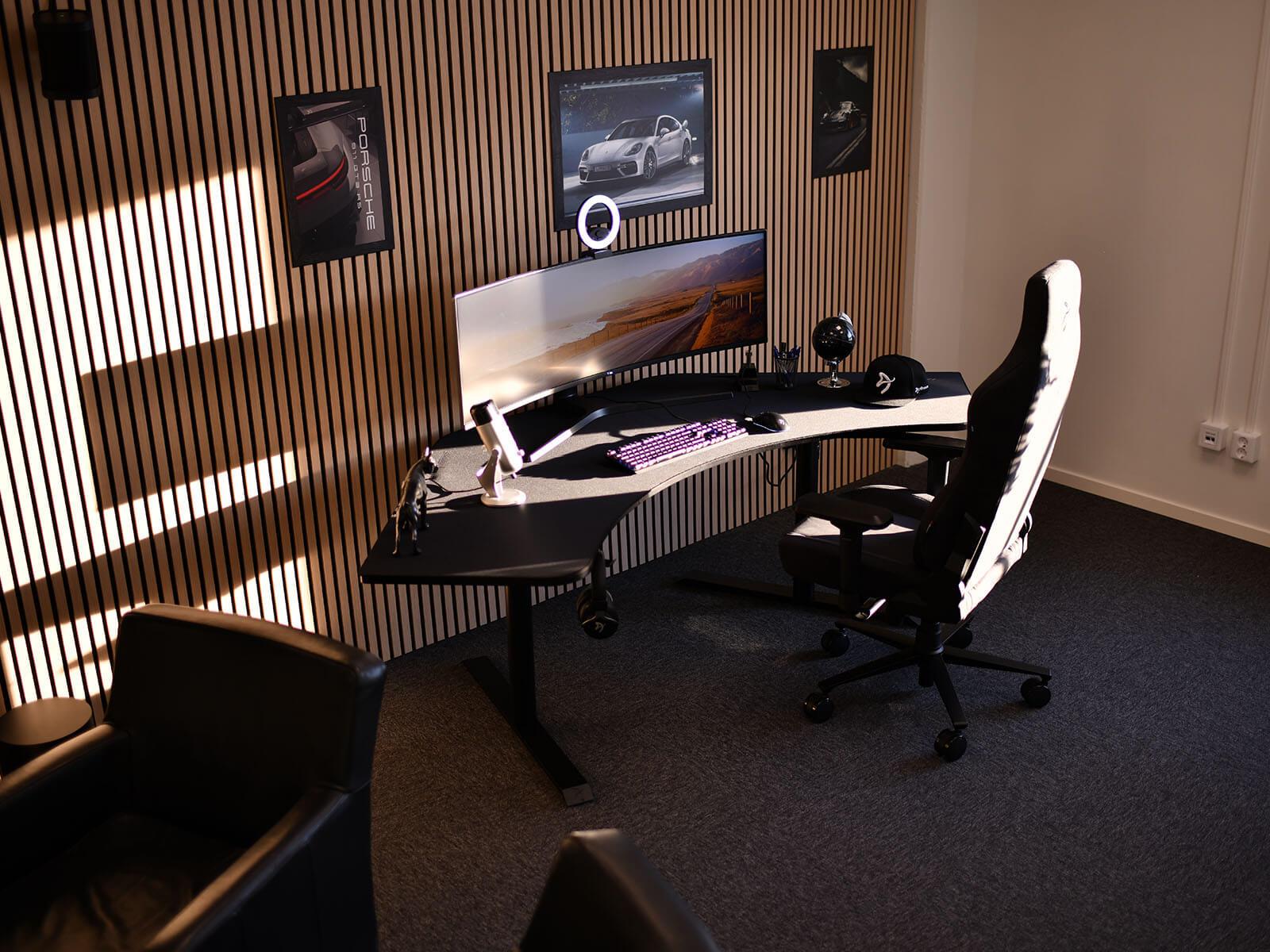 The entire surface of the desk is covered with a liquid repellent, microfiber mousepad. The desk features three strategically positioned cutouts, used for attaching your monitors or guiding cables neatly to a mesh basket snugly secured beneath the desk.