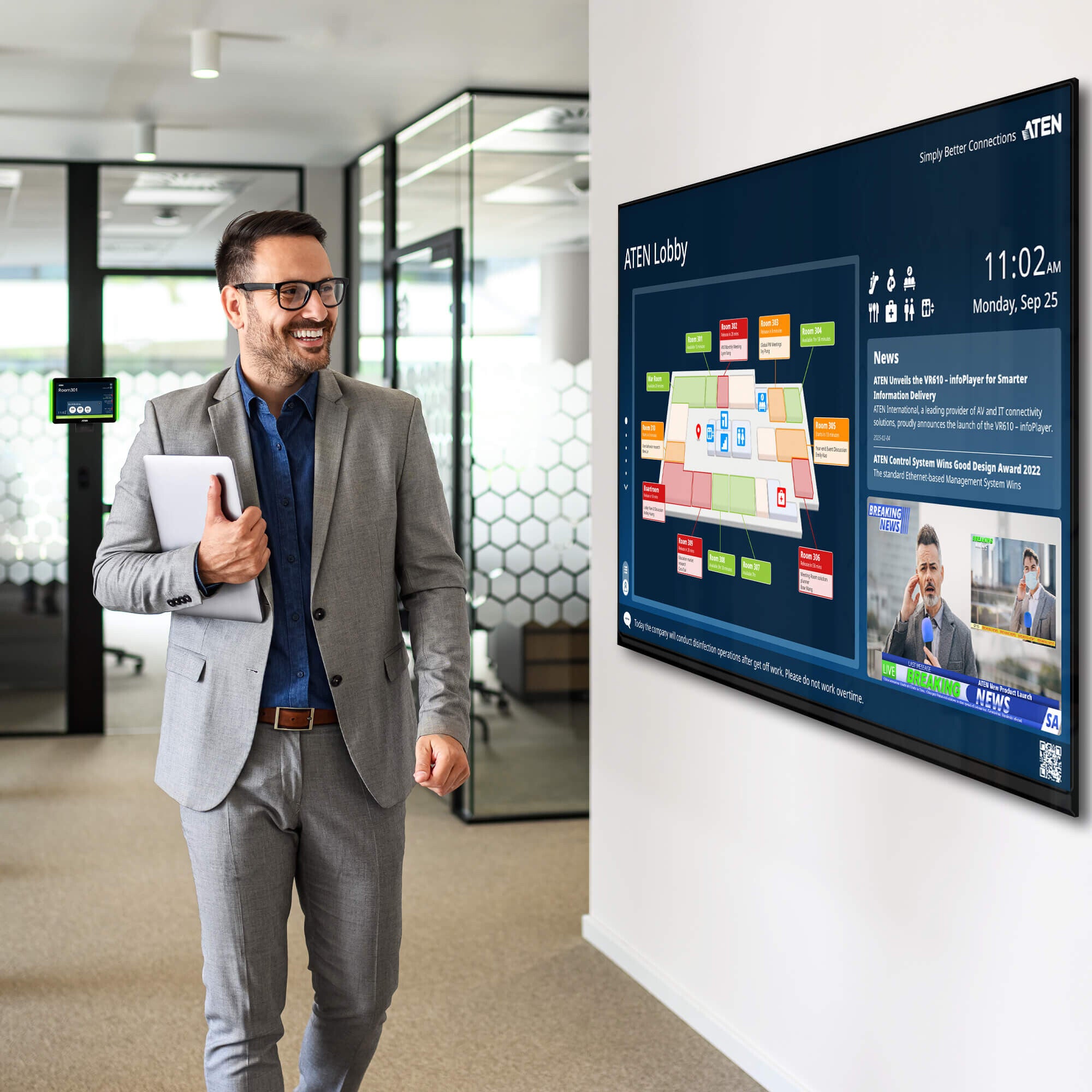 The VR610 infoPlayer is an innovative wayfinding and interactive directory solution designed to enhance navigation and information sharing for any kinds of corporate and campus spaces. This versatile solution, working perfectly with VK430 RBS Panels, displays real-time details about room availability, status, and location, offering users both an organized list and a dynamic map view for easy navigation. Fully integrated into the Room Booking System, the VR610 makes the room booking process more engaging and intuitive. By combining vibrant multimedia content with user-friendly features, it transforms how users interact with their environment, creating an immersive and enjoyable experience while efficiently guiding them to their destination.