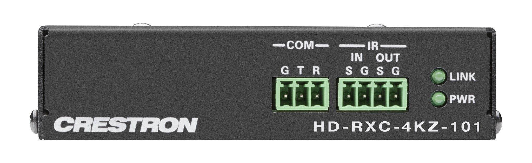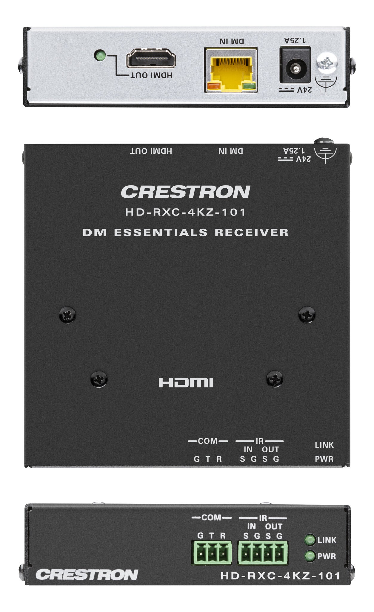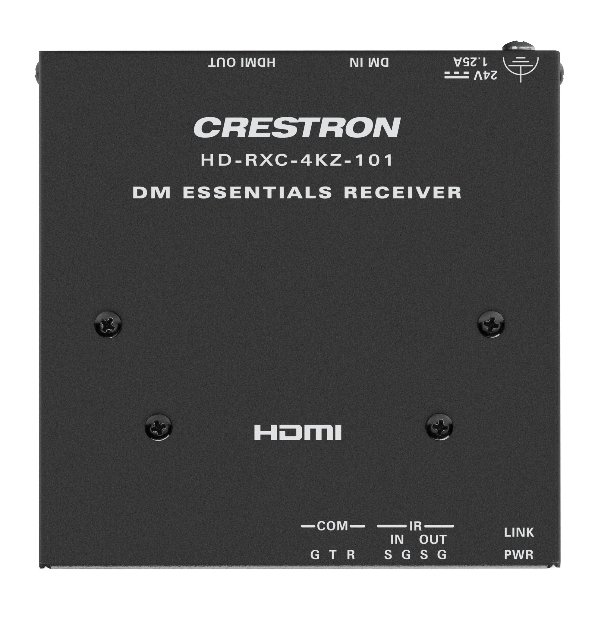 The HD‑RXC‑4KZ‑101 is a DM® Essentials 4K60 4:4:4 receiver designed to interoperate with a DM® Essentials transmitter or DMPS Essentials switcher for the transmission of HDMI®, RS-232, and IR signals. A CAT5e or higher twisted pair cable (Crestron DM‑CBL‑8G or DM‑CBL‑ULTRA sold separately) is needed to connect the HD‑RXC‑4KZ‑101 to the DM Essentials transmitter or DMPS Essentials switcher. For 1080p, WUXGA, and 2K signals, a cable length of up to 230 ft (70 m) is supported. For UHD and 4K signals, a cable length of up to 130 ft (40 m) is supported.
