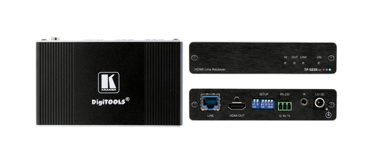 TP−583Rxr is a high−performance, extended−reach HDBaseT receiver for 4K HDR HDMI, RS−232 and IR signals over twisted pair. TP−583Rxr converts the HDBaseT signal and outputs it to its HDMI and control ports. It enables extending video signal up to 100m (330ft) at 4K@60Hz (4:4:4) video resolution, up to 180m (590ft) at 4K@30Hz (4:4:4), and up to 200m (650ft) at HD video resolution over Kramer copper cables. It is compatible with standard HDBaseT−compliant extenders at 4K@30Hz and HD video resolutions.