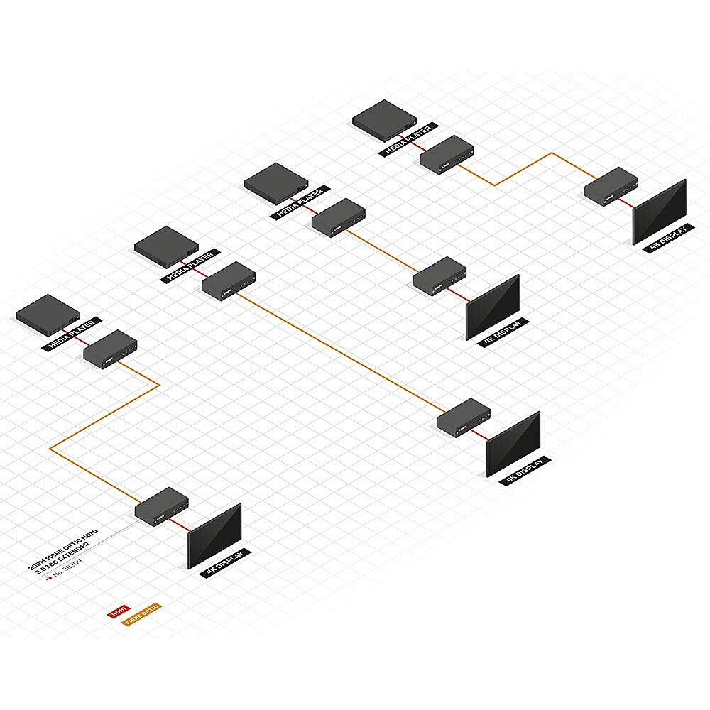 The extender system comprises two modules, a transmitter and a receiver, which are connected to both the HDMI source and display using standard HDMI cables, for the best results we recommend the use of 1m GOLD HDMI cables on both the input and output. The modules are then connected together using a single, standard 'off the shelf' OM3 MPO fibre optic cable (12 Core with 'Method A' Termination) of up to 200m in length (fibre optic cable is not included).Compatibility Remark: During extensive tests we found a compatibility issue unique to the Xbox 1S due its weak HDMI signal quality at 4K 60Hz 4:4:4. Unfortunately there is no solution to this issue until Microsoft improves the output signal quality of the Xbox 1S.