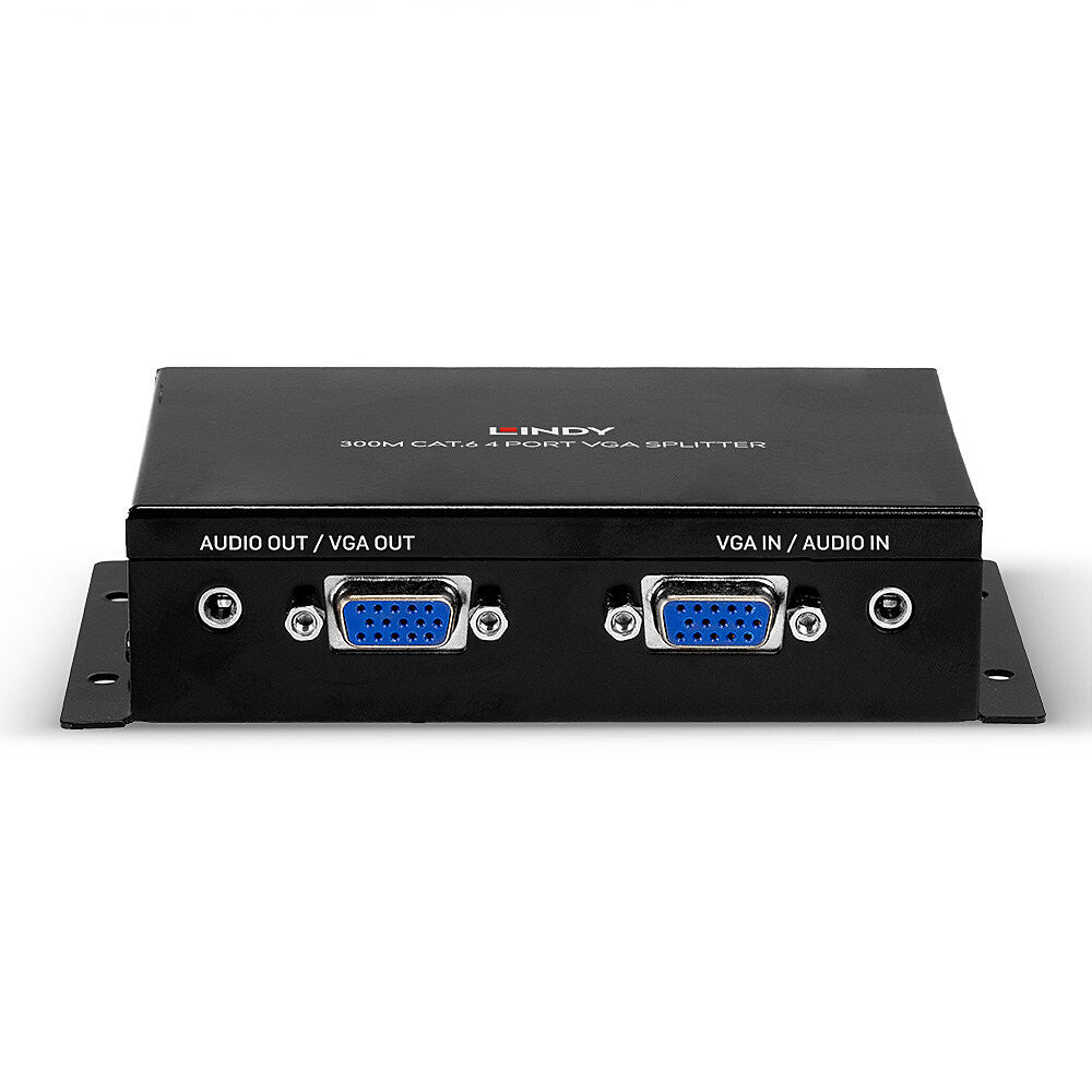 The Lindy 300m Cat.6 4 Port VGA Splitter is a high-quality solution for extending 4 separate analogue VGA signals over long distances using standard network cables when combined with the compatible receiver unit (35404). Supporting resolutions up to 1920x1080, this extender splitter provides high quality video for up to 4 separate distribution zones, such as classrooms or in security facilities. A 3.5mm female port ensures source devices or embedded audio can be added within the connection.