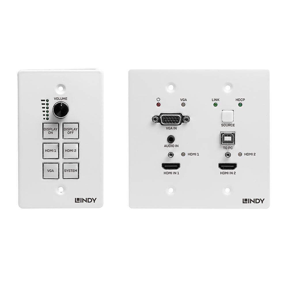 An HDBaseT multi-AV transmitter with support for HDMI, VGA with audio and USB inputs which can be surface mounted. An HDBaseT receiver with dual channel analogue audio extraction, microphone input, RS232 and USB control from an interactive board, designed for discreet installation. Finally, a separate wall mounted room control panel is included to quickly switch between input devices, adjust volumes and power on or off the display.