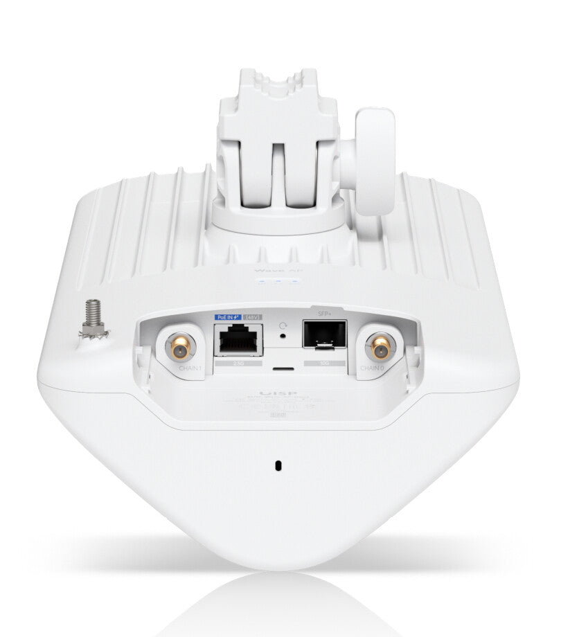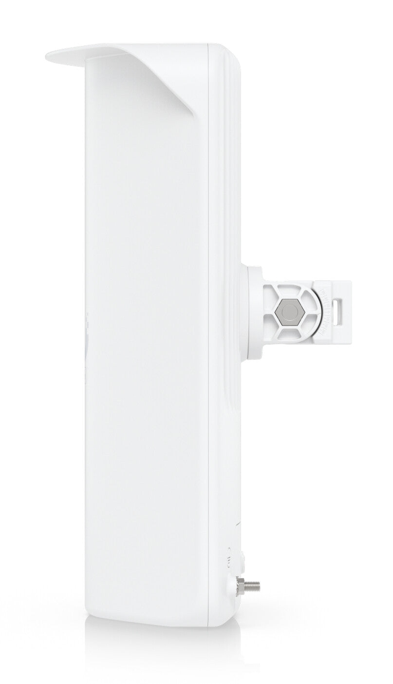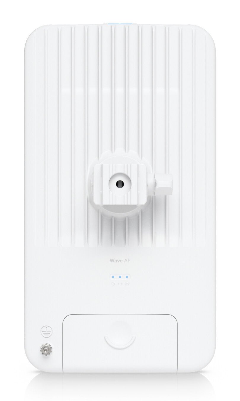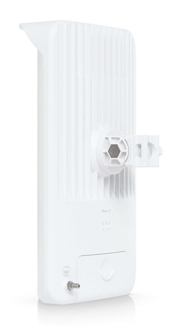 60 GHz + 5 GHz multipoint base station featuring 90-degree sectoral coverage, 31-client capacity, 2.7 Gbps symmetrical speed, and antenna connectors for 5 GHz range extension.