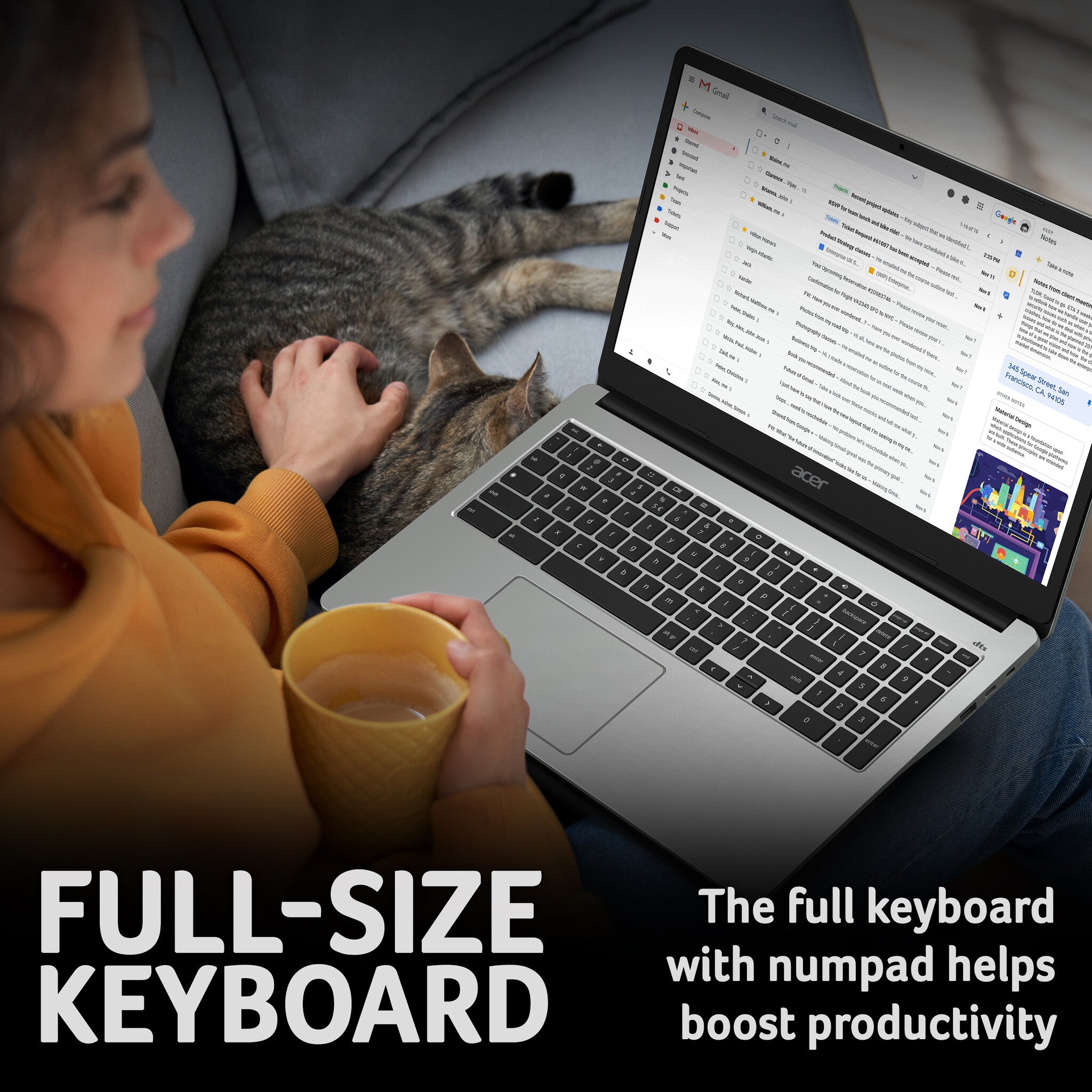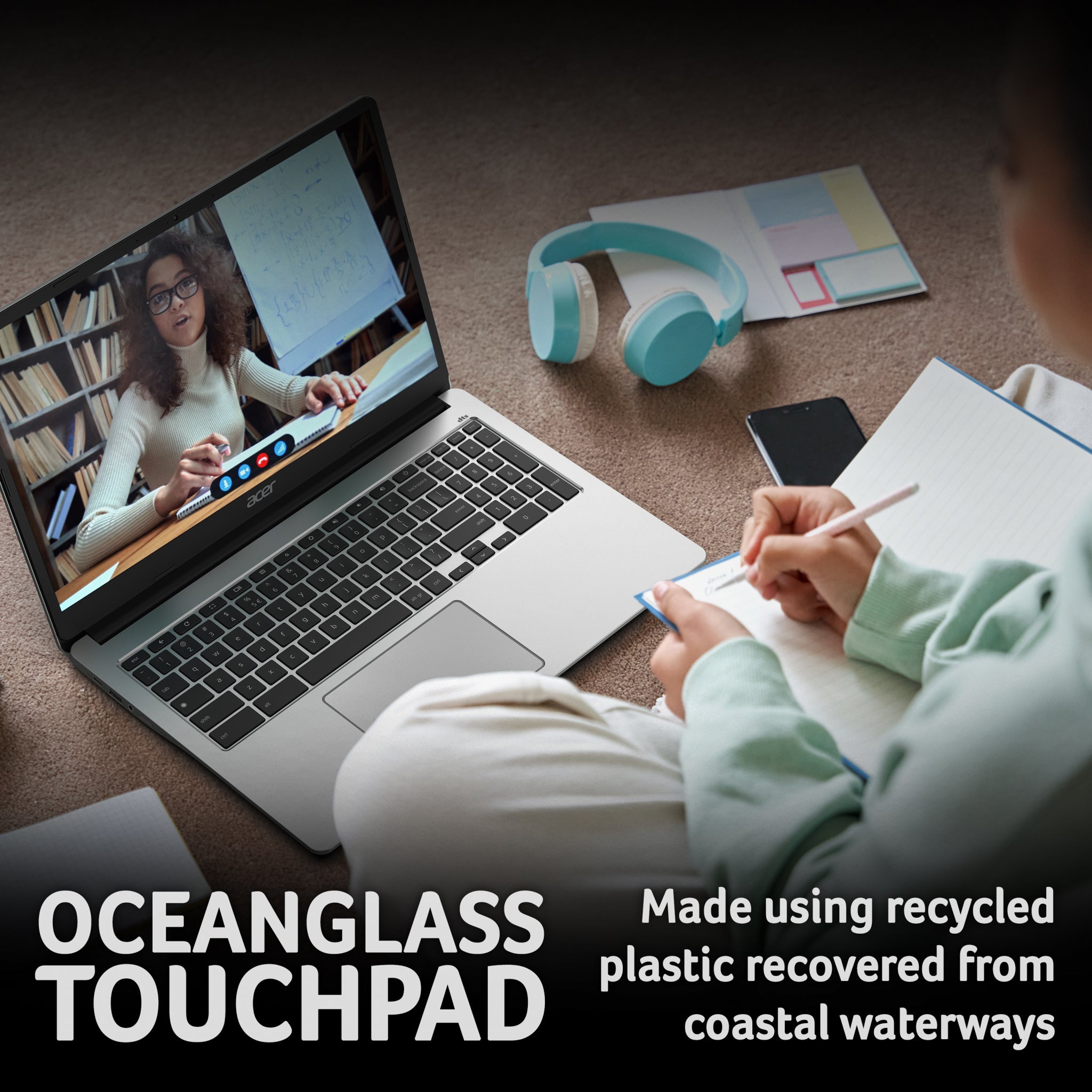 The Acer Chromebook 315 features a 15-inch anti-glare screen designed to let you get more done, no matter where you are. You'll stay focused in the classroom, home, or office with a dedicated number pad, a fast processor, and an eco-friendly OceanGlass touchpad.
