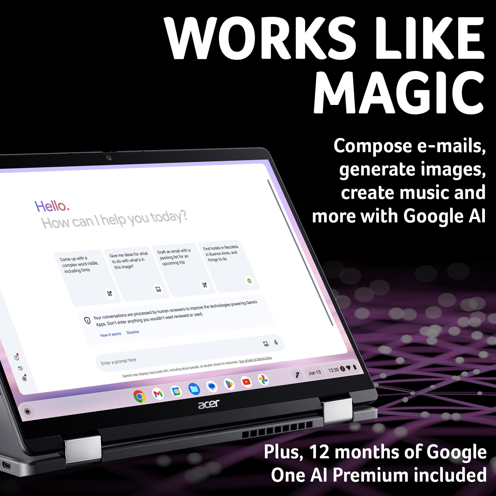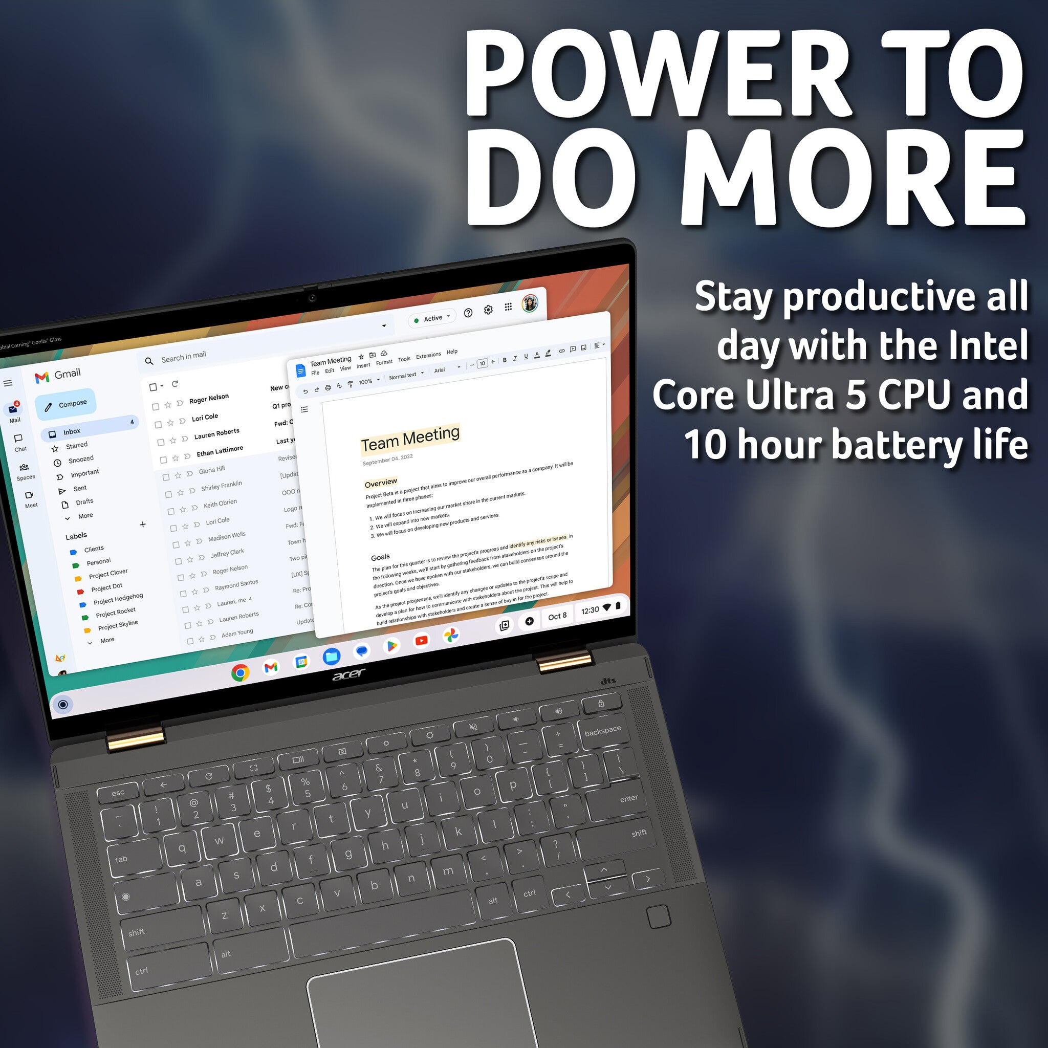 Powered by the latest Intel® Core™ Ultra Processors1–the Acer Chromebook Plus Spin 714 is the embodiment of power and portability. A premium thin and light 2-in-1 convertible Chromebook for on-the-go study, work, or play.