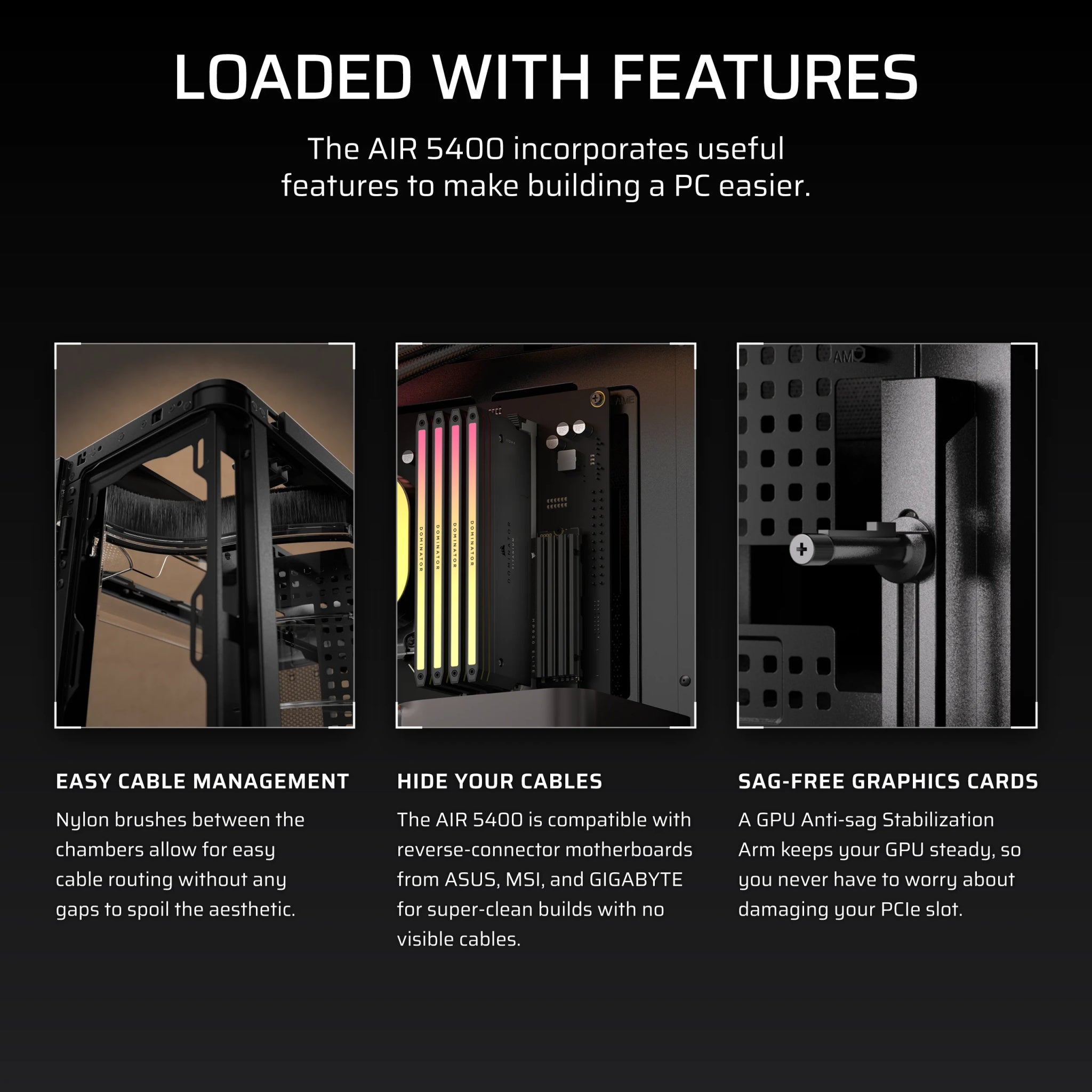 The AIR 5400 includes 3x 120mm reverse-rotor intake fans in the bottom, with room for 7x more in the CPU chamber, roof, and rear exhaust for highly effective airflow in both chambers.