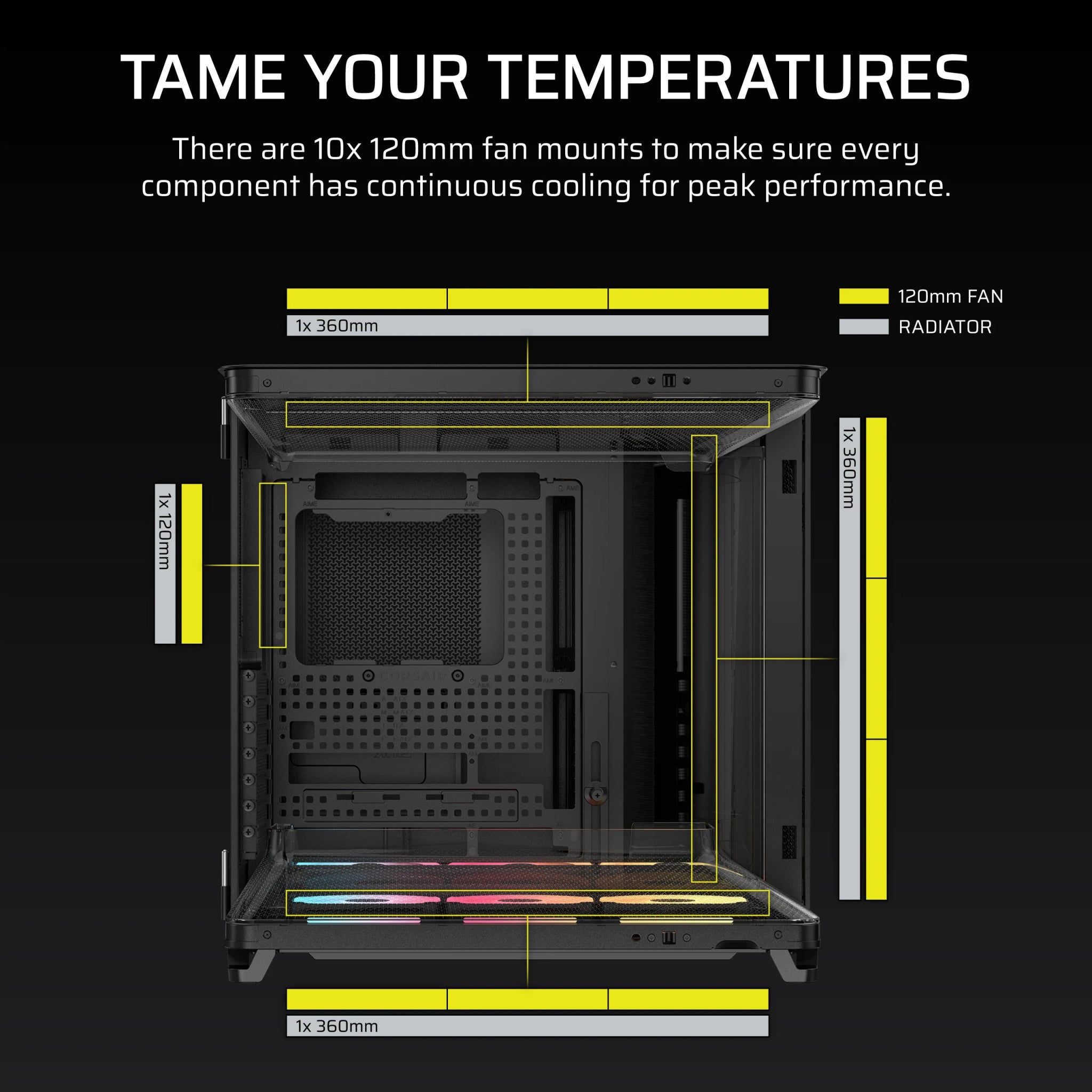 3x 120mm intake fans are included with an additional 7x 120mm fan mounts for serious airflow.