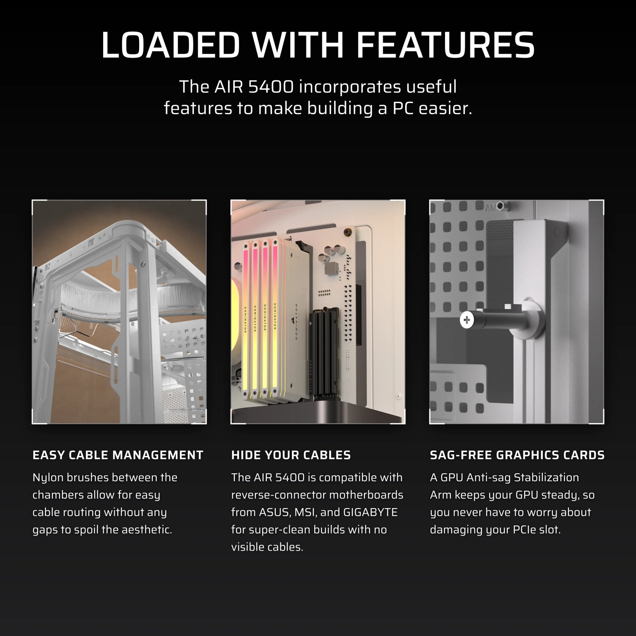 The AIR 5400 includes 3x 120mm reverse-rotor intake fans in the bottom, with room for 7x more in the CPU chamber, roof, and rear exhaust for highly effective airflow in both chambers.