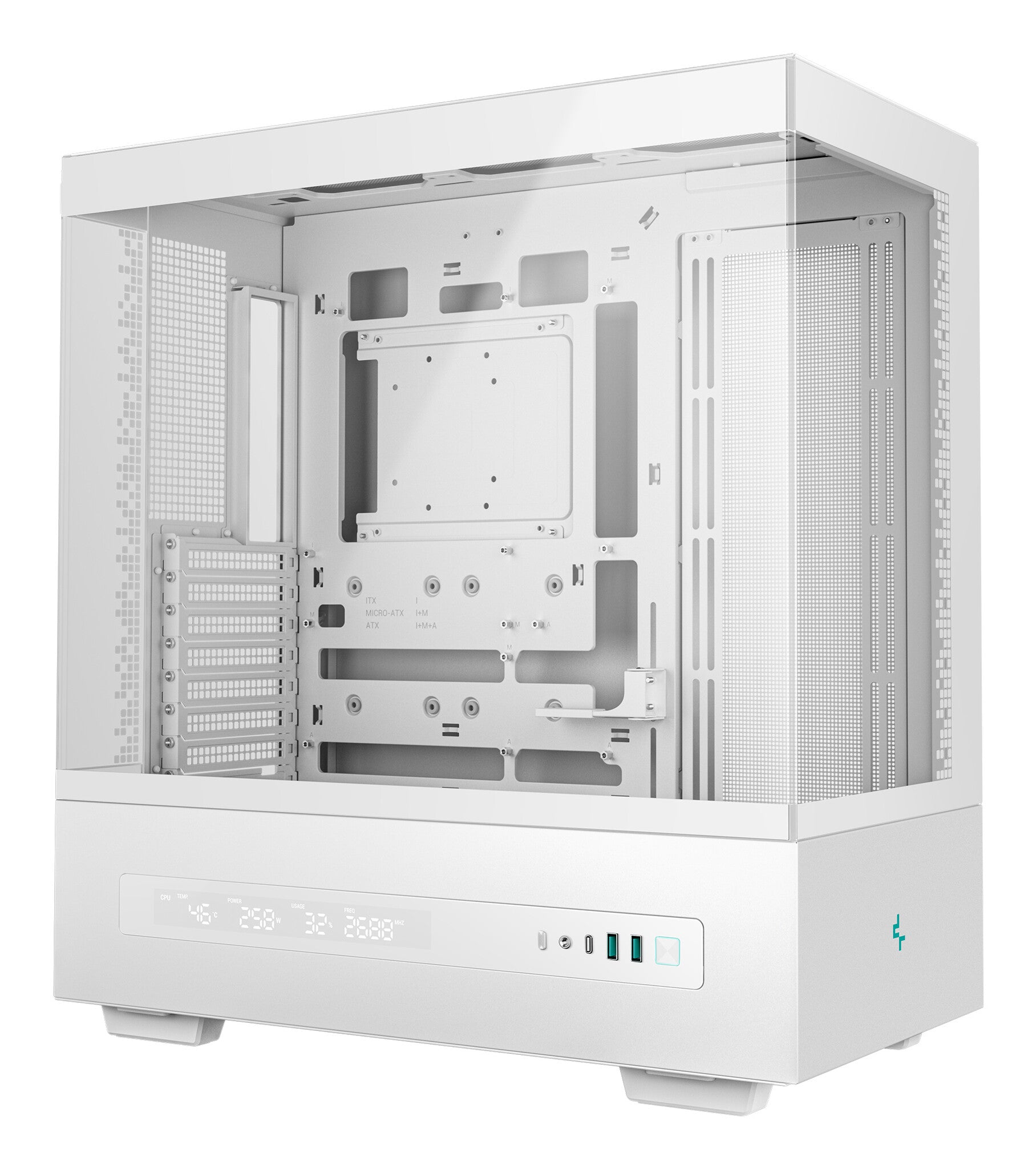 The CH690 DIGITAL WH case features a cutting-edge digital display that offers real-time monitoring of system's vital statistics. With switchable modes for CPU, GPU, and PSU, effortlessly track temperature in Fahrenheit or Celsius, power consumption, usage, and frequency. The CPU mode also includes fan speed monitoring, while the PSU mode provides additional insights into fan performance. This sophisticated display transforms the system into a high-tech command center, allowing optimal performance and efficiency at a glance.