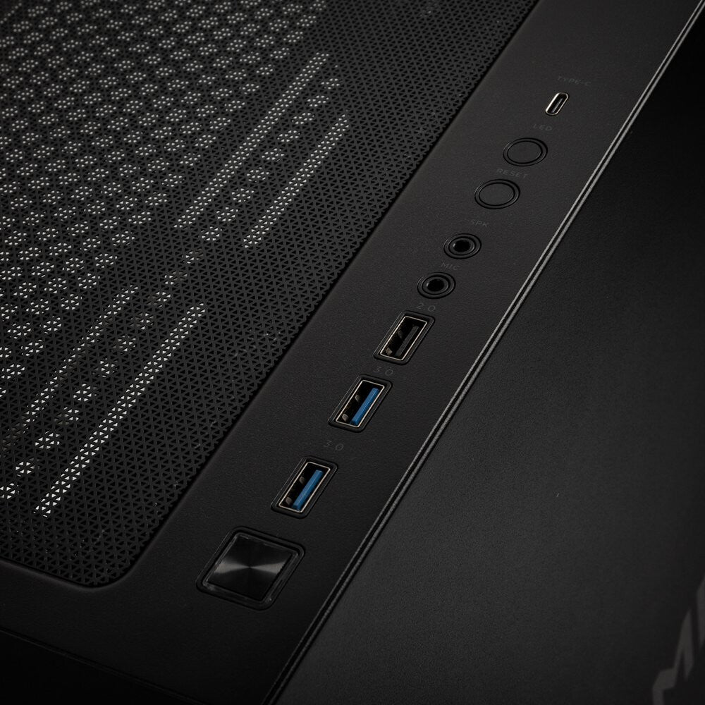 Keeping you connected, the I/O panel features two USB 3.1, one USB 3.2 Gen 2 Type-C, and one USB 2.0 ports, HD audio and microphone jacks, as well as buttons for power, resetting, and RGB control.