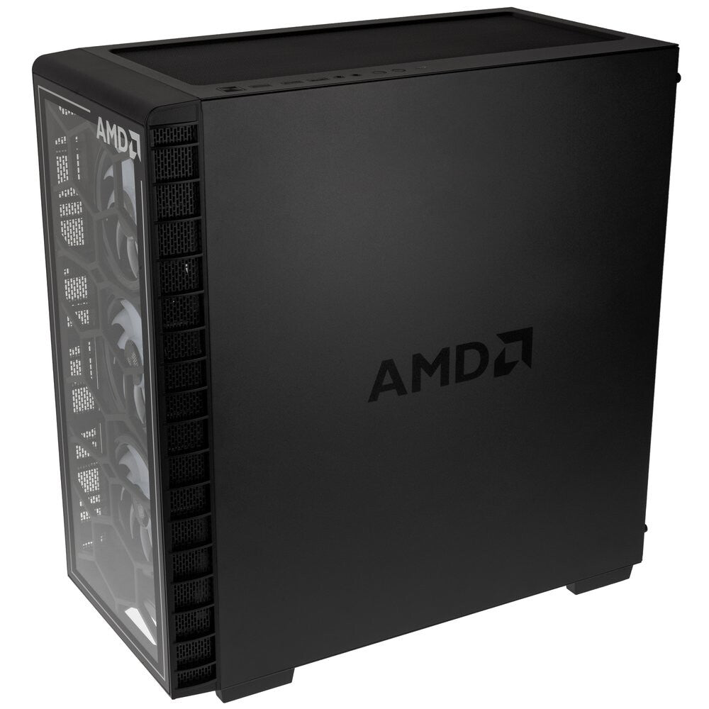 - Mid-tower PC case with AMD branding on tempered glass panels