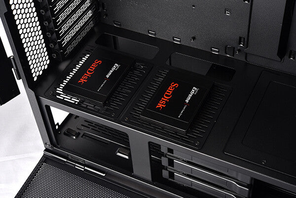 The tempered glass side panels offer an unobstructed view to the interior configuration while the bottom shroud panels provide quick access to PSU/drive installation.