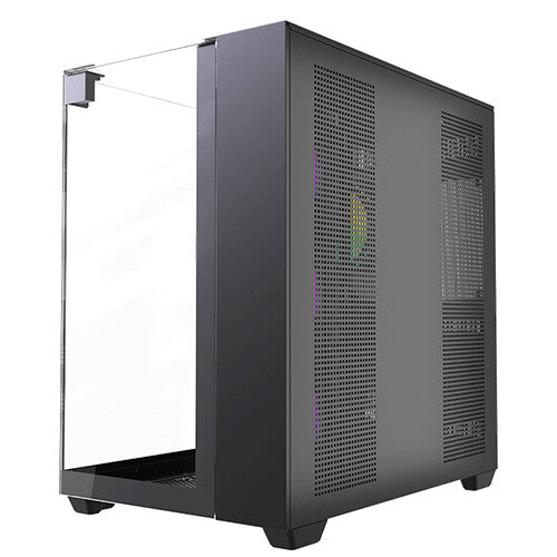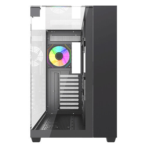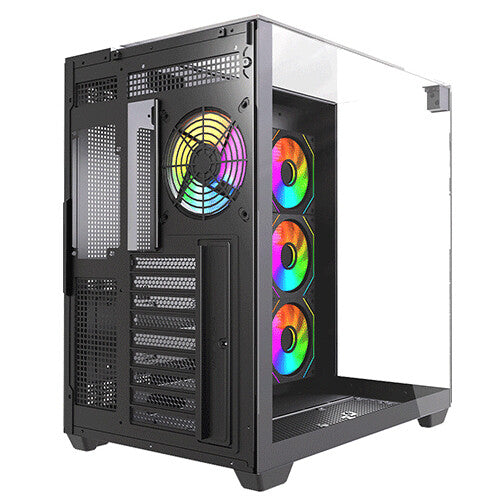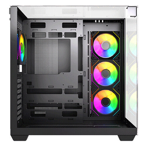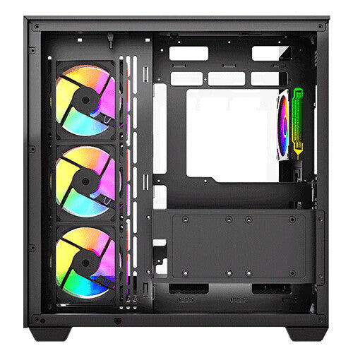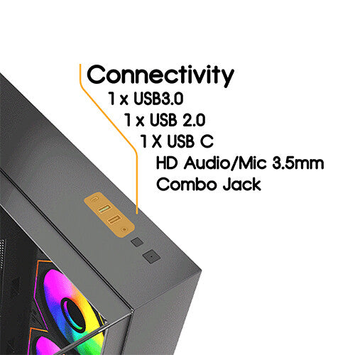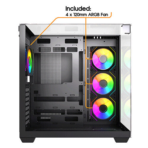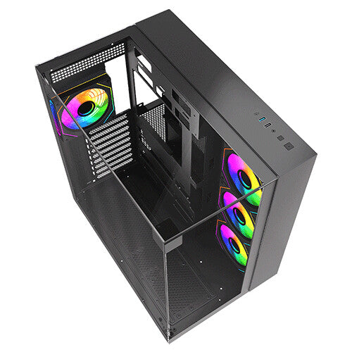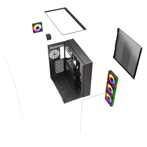 Immerse yourself in a 360-degree view of your build with triple tempered glass panels—front, left, and top. Every component, every LED, every detail is showcased in breathtaking clarity. ARGB Brilliance: Illuminate your system with vibrant ARGB lighting, controlled by the included ARGB hub and compatible with motherboard synchronization. Create a mesmerizing light show that reflects your unique style.