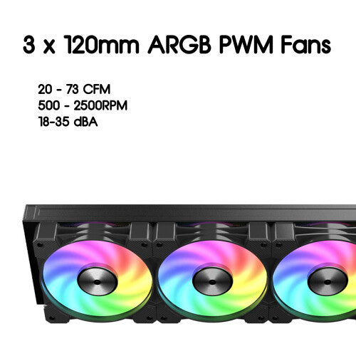 Supporting up to 300W TDP, the Trifrost is built to handle the latest Intel and AMD CPUs with ease. PWM-controlled fans spin from 500–2500 RPM and move up to 73 CFM of airflow, while fluid dynamic bearings ensure long-lasting quiet operation. The robust pump runs at 2500 RPM, delivering a steady 1300ml/min flow rate for consistent heat dissipation.