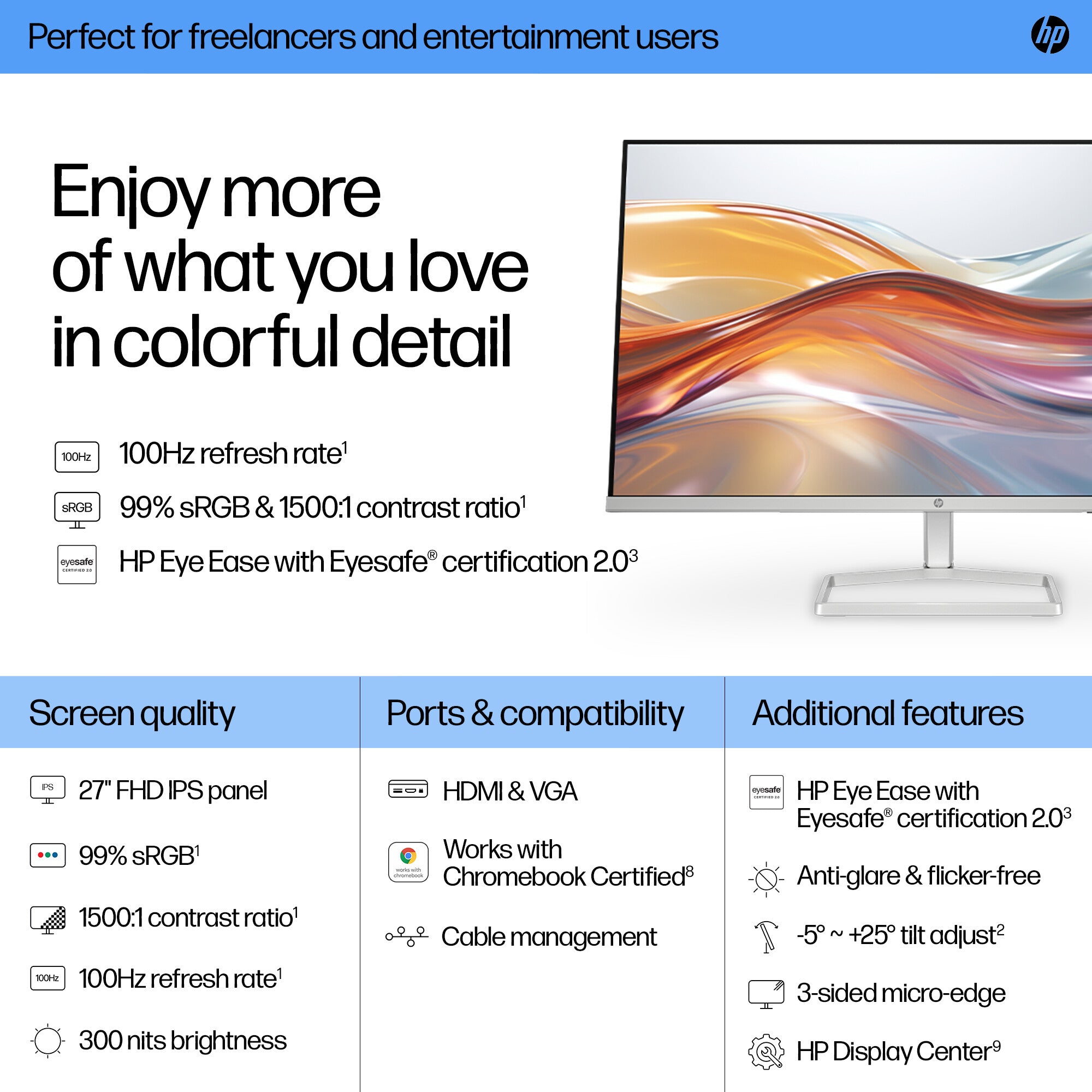 Get lost in any passion project with the HP Series 5 27-inch FHD Monitor. Its sleek, thin-and-light design gives you the flexibility to enjoy entertainment while vibrant color and deep contrast ratio lets you see everything as it was meant to be seen. Enhance your screen time and your pastime with a higher refresh rate[1] for a screen-tear-free experience.