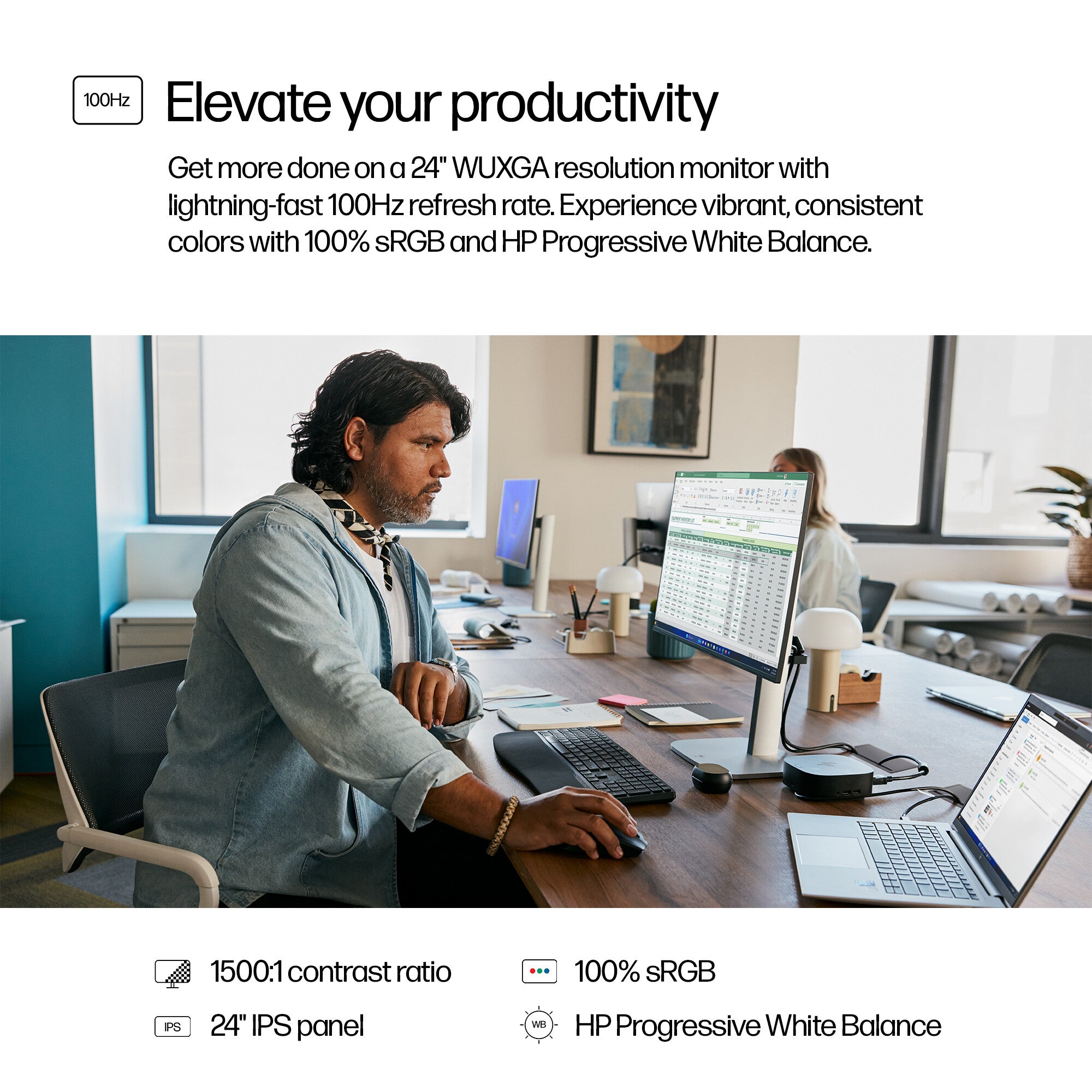 • Get more done on this 24" WUXGA resolution monitor with 100 Hz refresh rate.[1] Experience vibrant, consistent colors with 100% sRGB[1] and HP Progressive White Balance.[2]