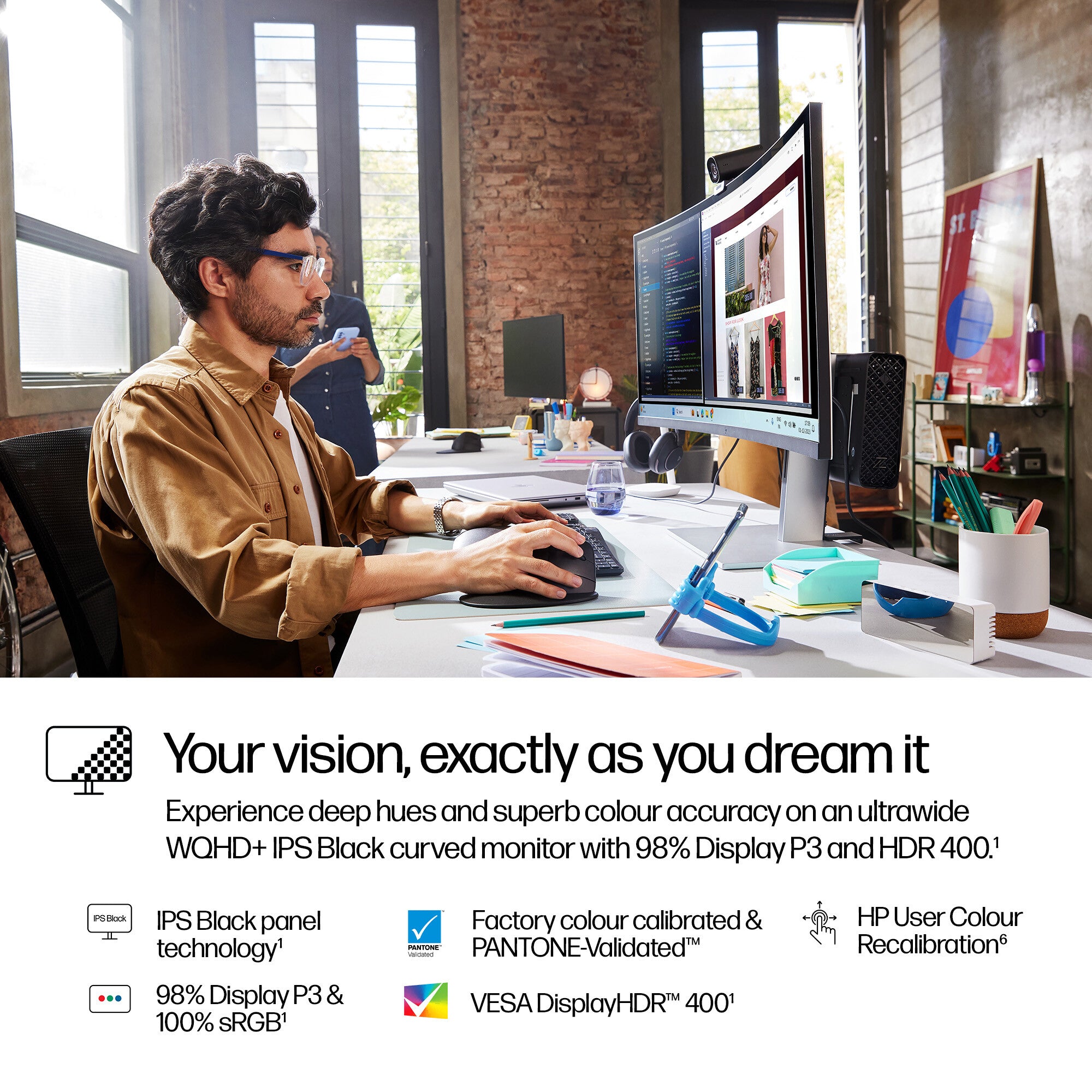 - Experience deep hues and superb color accuracy on an ultrawide WQHD+ IPS Black curved monitor with 98% Display P3 and HDR400.[2]