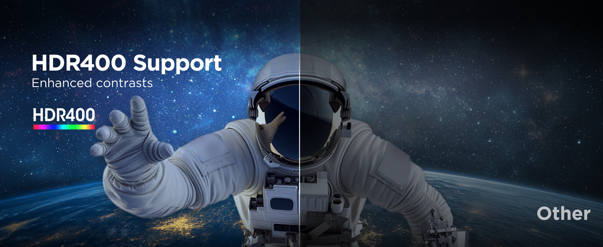 HDR 400 delivers higher brightness, higher contrast, wider colour gamut and deeper black displays.