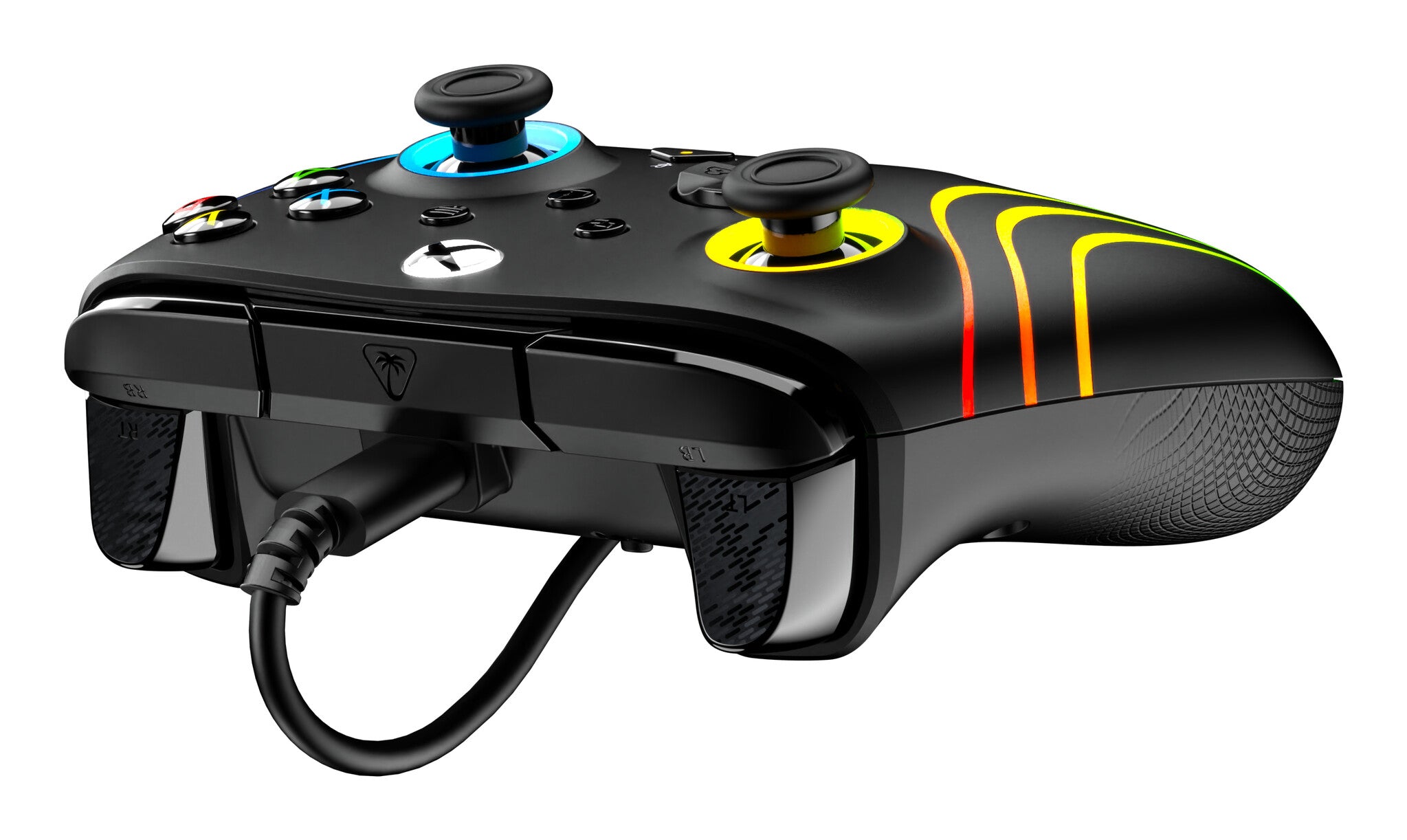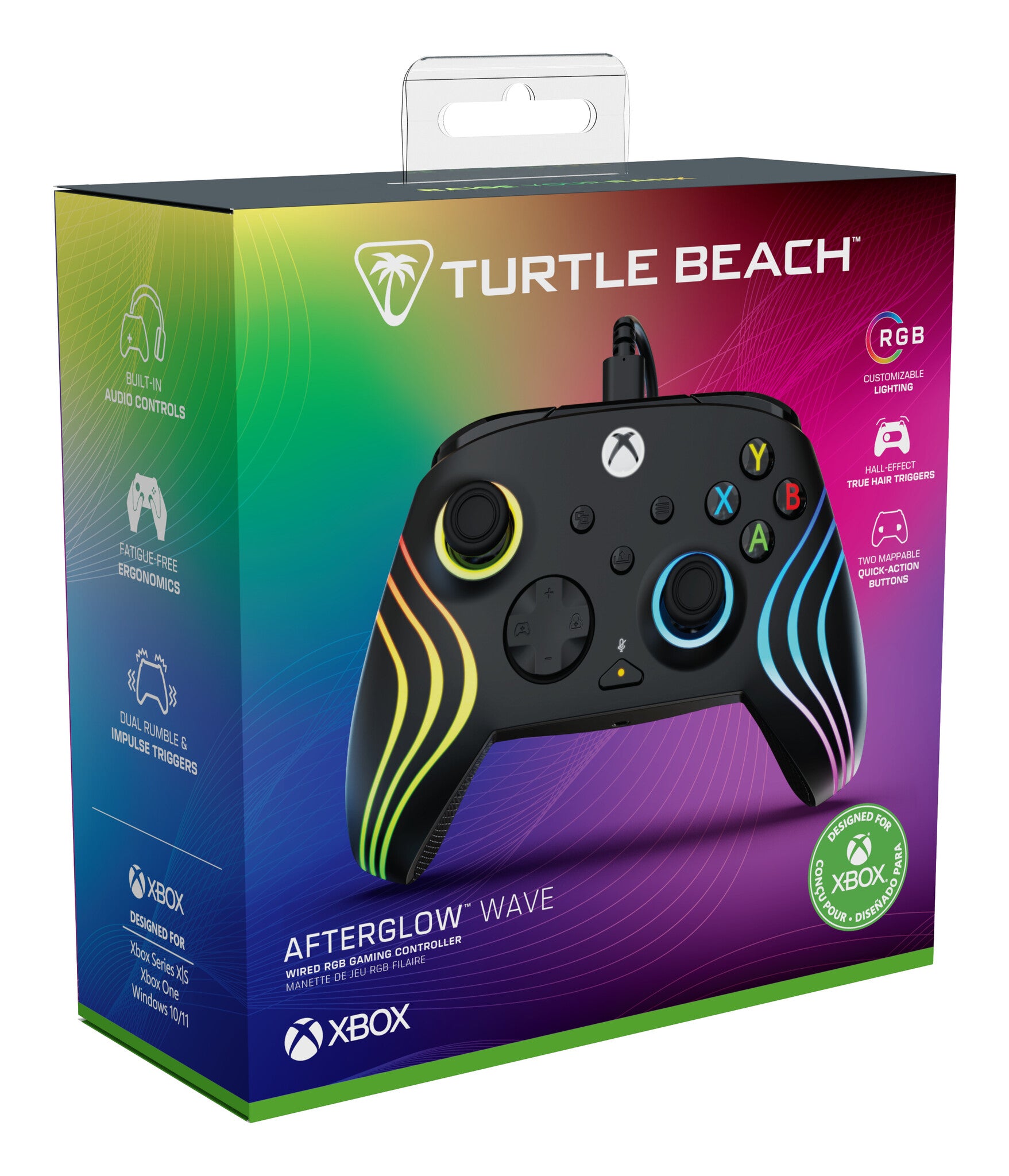Unlock elevated gaming performance and style with the Turtle Beach® Afterglow™ Wave RGB gaming controller for Xbox Series X|S, Xbox One and Windows 10 & 11 PCs. Featuring Hall-Effect 3-stop adjustable triggers, you can fine-tune trigger sensitivity and enjoy smooth, precise, and durable control. Customize your controller’s style with intelligent RGB lighting, offering eight unique lighting zones and eight different preset modes with adjustable brightness. Customize your gameplay with two mappable quick-action buttons, keeping essential commands within close reach. Stay locked in with patented D-pad audio controls at your fingertips, allowing for instant adjustments to game/chat volume mix and master volume, plus a dedicated mic mute button. Download the Control Hub companion app for Xbox consoles & Windows PCs giving you advanced customization options for lighting, button mapping, as well as controller configuration and diagnosis. Dual rumble motors and impulse triggers provide immersive, responsive feedback, and an ergonomic shape with laser-etched textured grips ensures a fatigue-free feel. Officially licensed for Xbox and PC, the controller’s 10ft USB-C wired connection ensures reliable, lag-free gaming.
