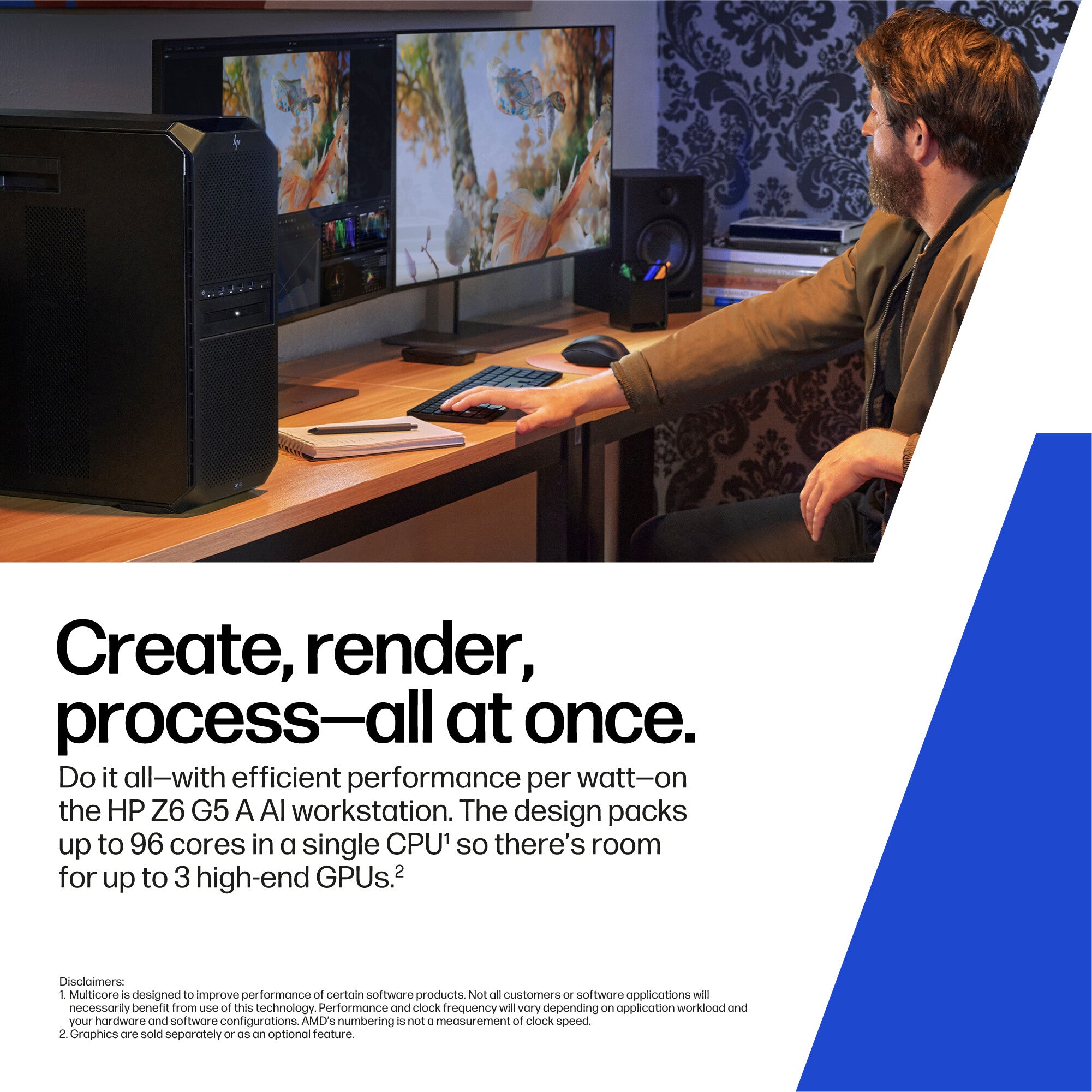 The refreshed HP Z6 G5 A is a powerhouse for AI workflows, 3D rendering and virtual production. Its innovative system design, with a next-gen AMD Ryzen™ Threadripper™ PRO CPU,[1] combines an astounding number of cores in a single CPU with up to 3 GPUs.[2] Create and render at once on intensive projects.