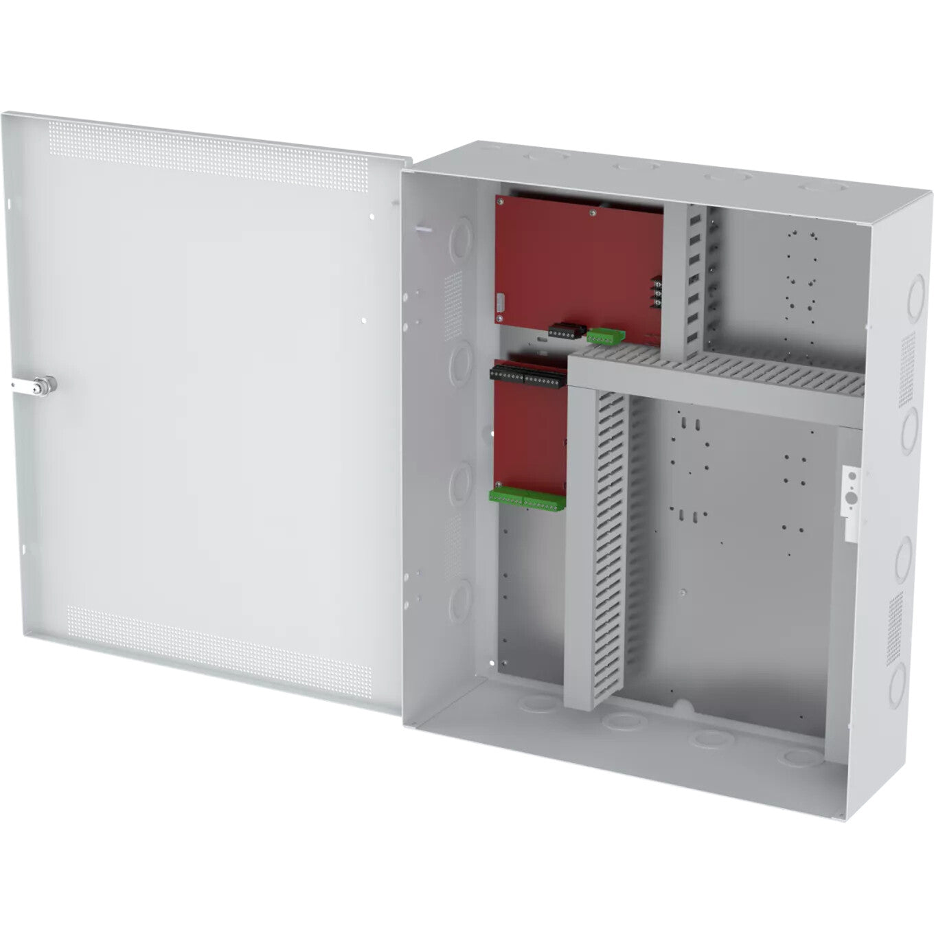 This enclosure is engineered for installer convenience. Its removable backplate allows off-site hardware mounting while cabling is done on-site, speeding up the installation process. Pre-drilled patterns ensure compatibility and save setup time. The enclosure frame features multiple knockouts for flexible wiring and a removable cover for easy access. A built-in tamper switch and lockset enhance physical security.