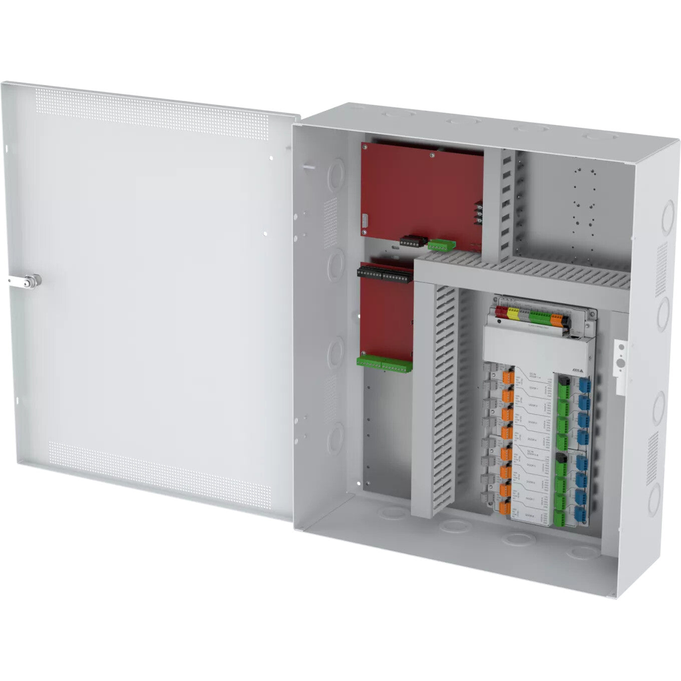 AXIS TA1203 Enclosure with Power Unit is a compact, all-in-one enclosure designed to simplify access control installations. It integrates a 250W power supply, and support for battery charging and backup, all preassembled in a UL recognized steel enclosure. Built to work seamlessly with AXIS A1810-B Network Door Controller, it provides a standardized and scalable platform for eight-door systems. With factory-assembled components included, AXIS TA1203 reduces field wiring complexity.