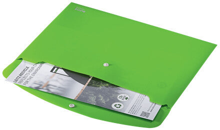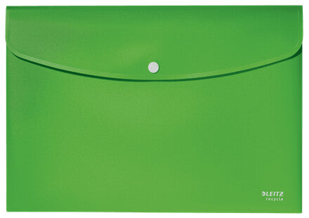 Eye-catching, premium quality PP Document Wallet for every day use in school, office and home with push button closure to prevent documents from sliding out. Made from 80% recycled plastic, 100% recyclable and with Blue Angel environmental certification. This robust and practical document wallet perfectly complements other products from the Leitz Recycle range and is made to last. Modern and contemporary green stationery that will look great at home and in the office. With the eco friendly Recycle range from Leitz you can both improve your office environment – and the environment of our planet.