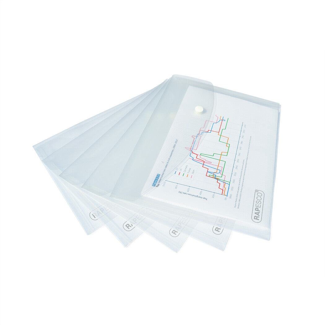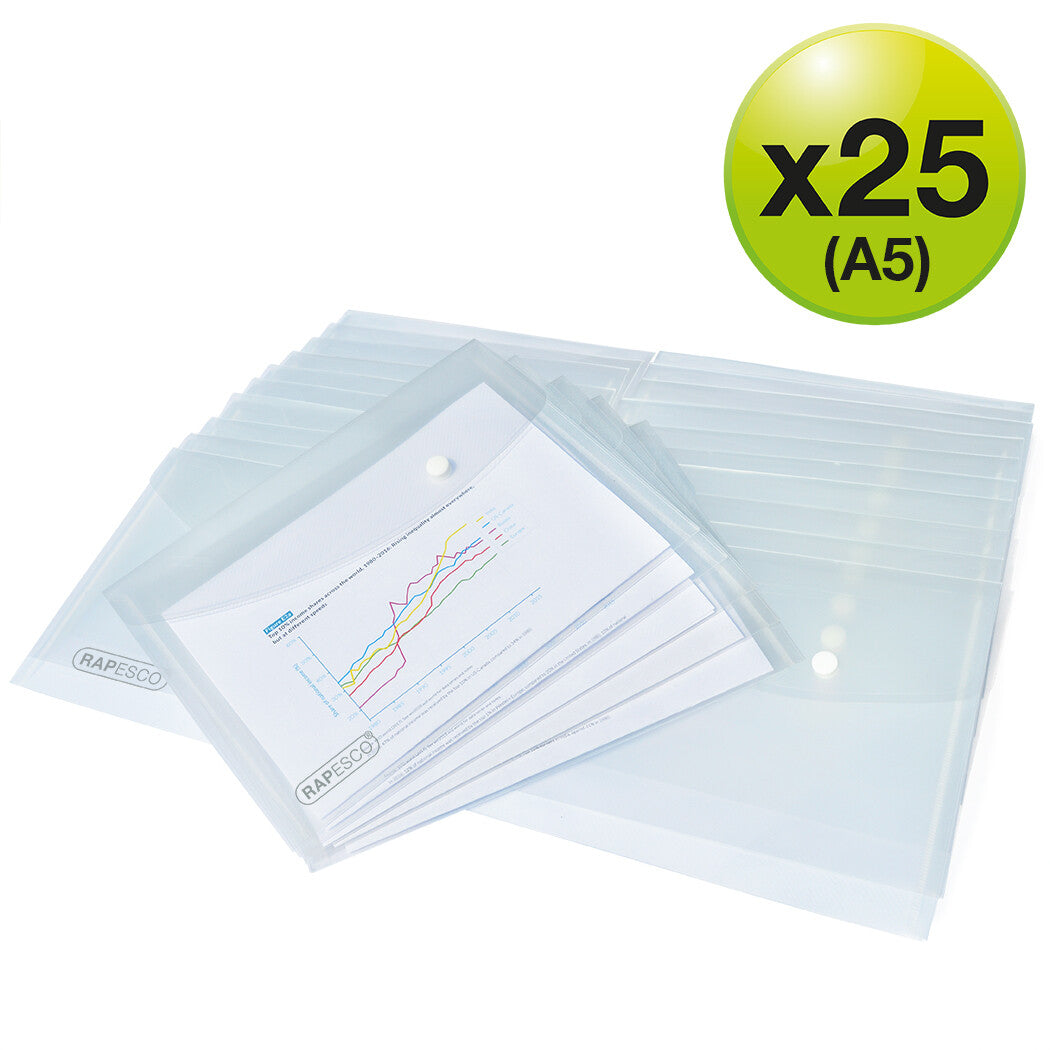 This A5 size Popper Wallet is ideal for use at the office, home or in education. It is popular as a general storage file for loose papers when attending meetings or for keeping papers tidy for filing. Its large capacity will hold up to 50 pages and it also features a fold-over flap with press-stud closure to keep papers secure. Under the curved flap you will also find a pen holder. Pack contains 25 x clear popper wallets.