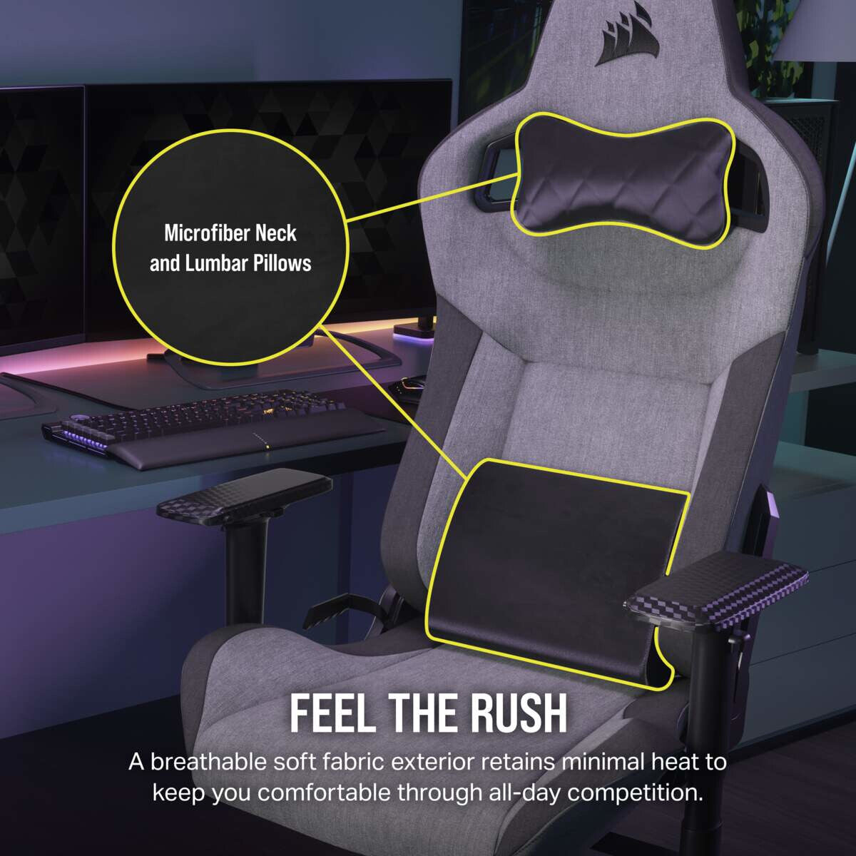 The CORSAIR T3 RUSH gaming chair combines racing-inspired design and contoured comfort, with a breathable soft cloth. exterior, padded neck cushion and memory foam lumbar support.