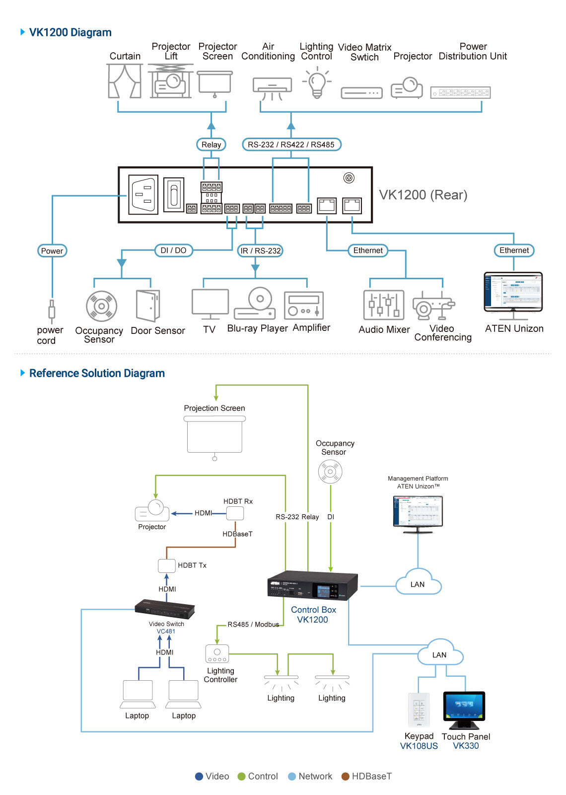 VK1200 is a part of ATEN’s Control System Series, a standard Ethernet-based management system, which consists of hardware, configurator software, control interfaces and related services, to control any hardware and software devices within a room setting, such as boardrooms and lecture halls, and to provide direct, centralized management effortlessly via user-defined GUIs from any mobile device, ATEN Keypad and Touch Panel.