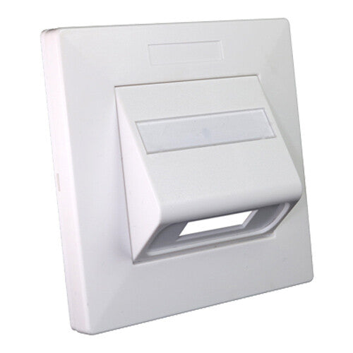 A single gang flat faceplate with an angled insert which will accept 1 x SC Duplex adaptor (not supplied) or 1 x LC Quad adaptor (not supplied).