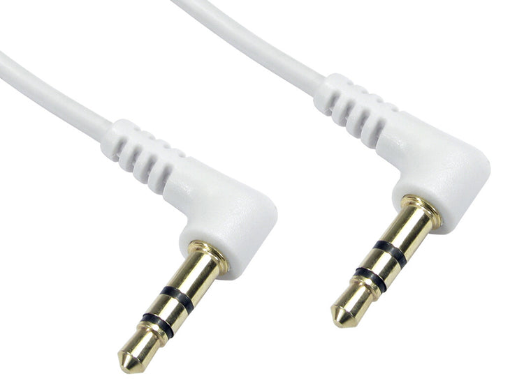 Our right angled range of audio cables are assembled with gold flashed connectors and available in black or white and in various lengths. The right angle connector is easier to connect equipment where a straight connector may cause the cable to bend and risking damage to the cable. While they have strain relief, the right angle can also act as strain relief within itself.