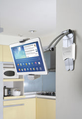 Seamlessly integrate your tablet into your home with CTA Digital’s 2-in-1 Kitchen Mount Stand. This sturdy and stylish aluminum stand can be mounted on a wall, under the kitchen cabinet or used as a countertop stand to conveniently access apps or watch videos. This mount features a secure adjustable holder designed for 7-10-inch screen tablets between 6-8.5 inches wide, so it can easily hold any current iPad model, including iPad Air and iPad Mini. It can also hold other tablet lines such as the Kindle Fire, Nexus, Galaxy Tab and Note tablets. The retractable holder locks in place and has special padding to securely grip and protect the tablet. The holder can also rotate 360° and is mounted to a highly adjustable stand with multiple joints that can pivot or rotate to get any viewing angle or position needed. Two mounting bases are included with mounting hardware to easily place in multiple locations in the kitchen, home or other preferred location. Once the bases are attached, the stand can easily be placed inside one and then can just as easily be removed to place in the other or simply used as a stand by itself. The base of the stand features expanding legs for extra stability, so it can be placed on a table or countertop for portable use. The tablet holder also has quick release buttons making the tablet easy to access and remove. So stay connected and enjoy more from your tablet at home with CTA Digital’s 2-in-1 Kitchen Mount Stand for iPad and Tablets.