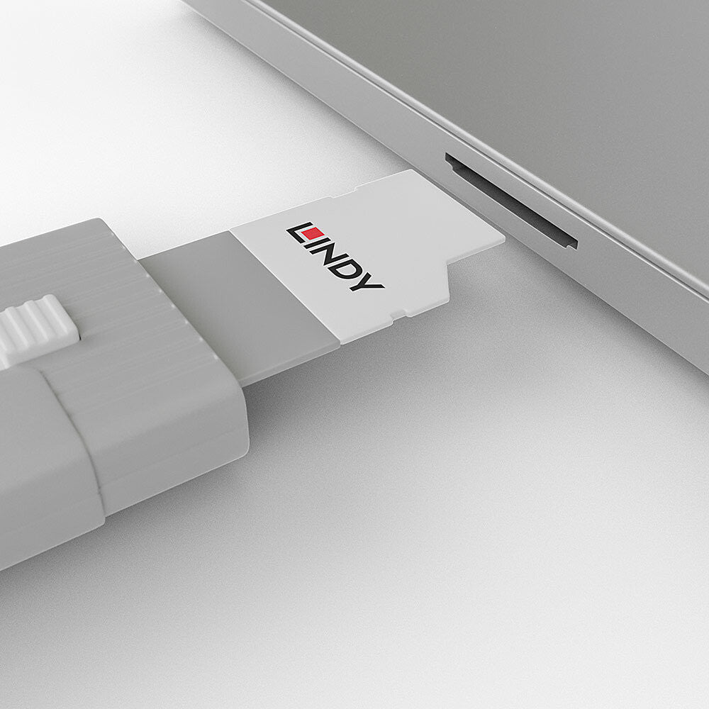 The SD Port Blocker is made up of a combined 'key' and 'lock' assembly which plugs into the SD Card. To use, simply plug the 'keylock' into the card slot and release the latch - the lock remains in place! Plug the key back into the lock to remove.