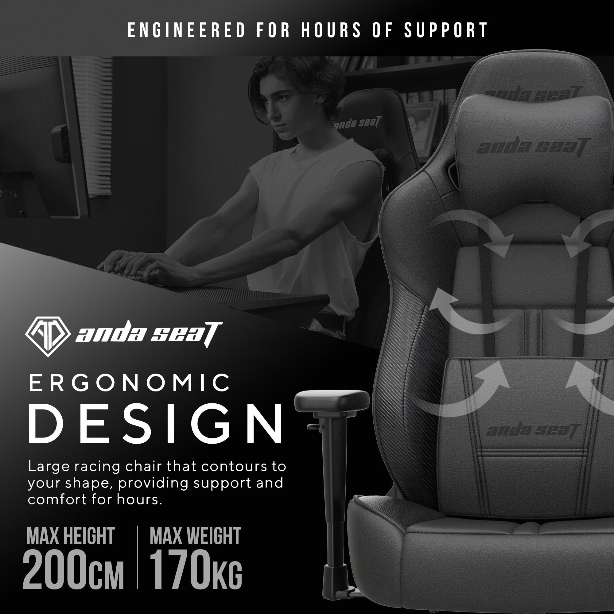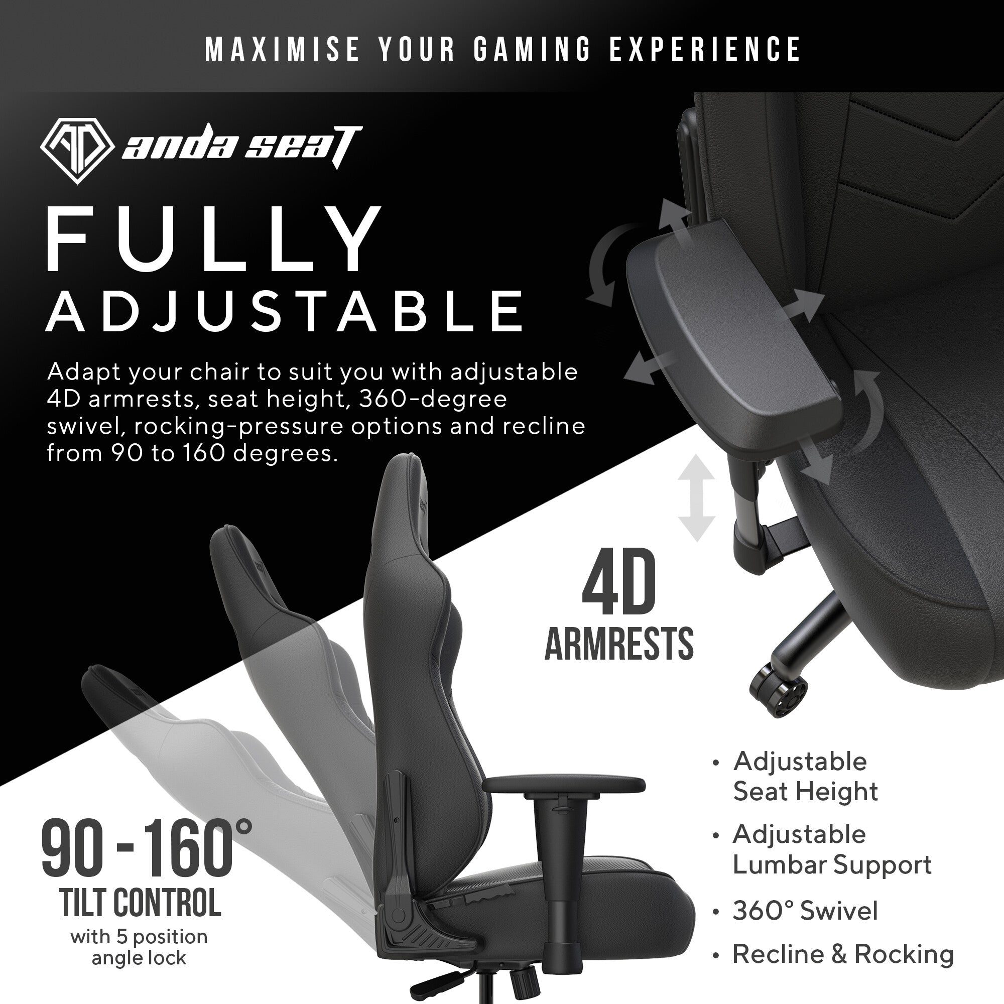 Built with you in mind the anda seaT Dark Demon Dragon is designed for those long gaming sessions. Rigged with premium PVC leather and high-density one-piece memory foam. The luxurious, ergonomic design guarantees all-day comfort with a H-shaped headrest pillow and large lumbar cushion. The 4D armrests for optimum posture support. Adjust the height with high performance Hydraulic Nitrogen Pistons. Find your perfect fit with the 90-160 backrest tilt, equipped with 5 angle lock positions. Perfect for your home office, living room or bedroom. Smooth bonded PVC leather computer desk chair. Scratch and stain resistant, Anda Seat produce perfect gaming chairs for adults or kids. As a previous race car seat manufacturer for BMW & Mercedes Benz, we insist on using the exact same leather material for our gaming seats.