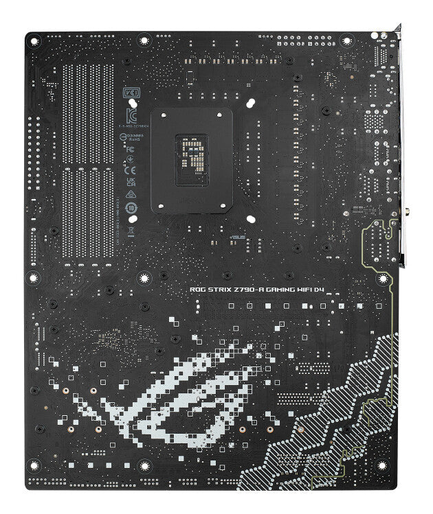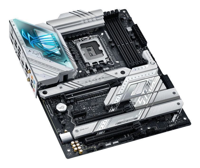The ROG Strix Z790-A boldly embraces the light, for an alternate take on build themes to its dark and brooding brother, the Strix Z790-F. Silver metallic heatsinks pop against a dark PCB backdrop and call attention to the board's high capacity for thermal management. A transparent layer on the I/O shield adds a unique touch and emphasizes the customizable RGB logo below. The whole design is tied together with ROG-centric detailing on the board, heatsinks, and I/O shield for a vibrant and futuristic outlook. Pair the Strix Z790-A with other products from the diverse ROG ecosystem to create a fully-customized gaming setup that reflects your personal style.