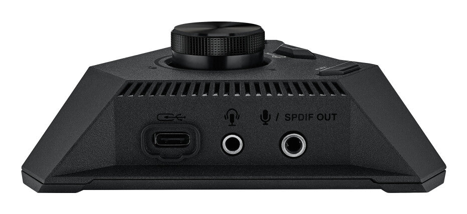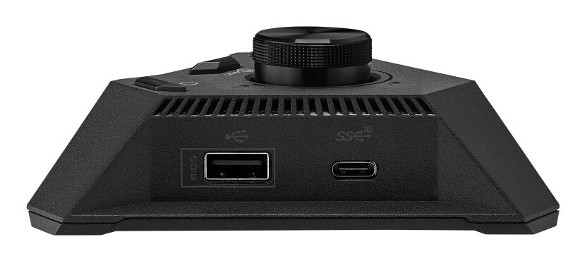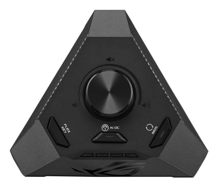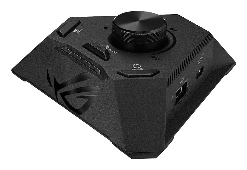 The all-new ROG Strix Hive brings critical controls and I/O within arm's reach, moving them from the cramped quarters of an SFF chassis to a compact peripheral that sits on the desktop. DIY-friendly buttons and diagnostic LEDs are brought front and center along with a large volume dial. On the sides, a varied group of I/O ports handle audio input and output and provide convenient connectivity for grab-and-go peripherals.