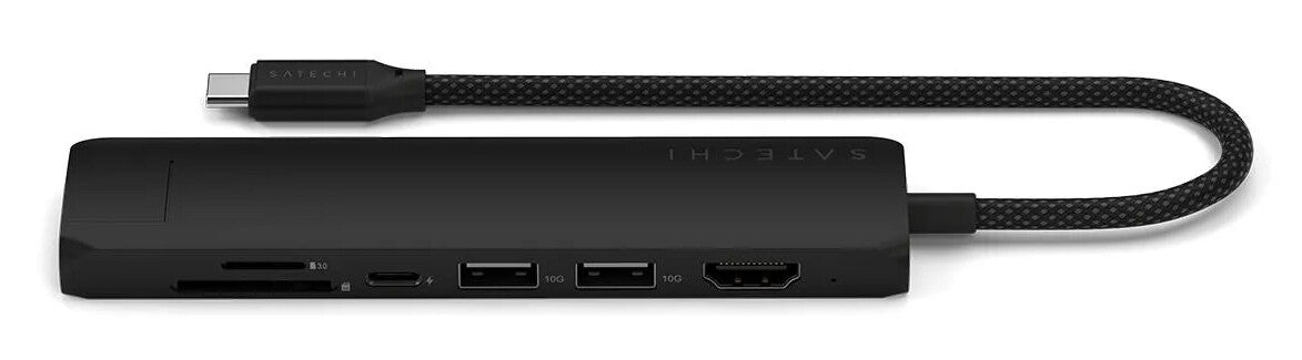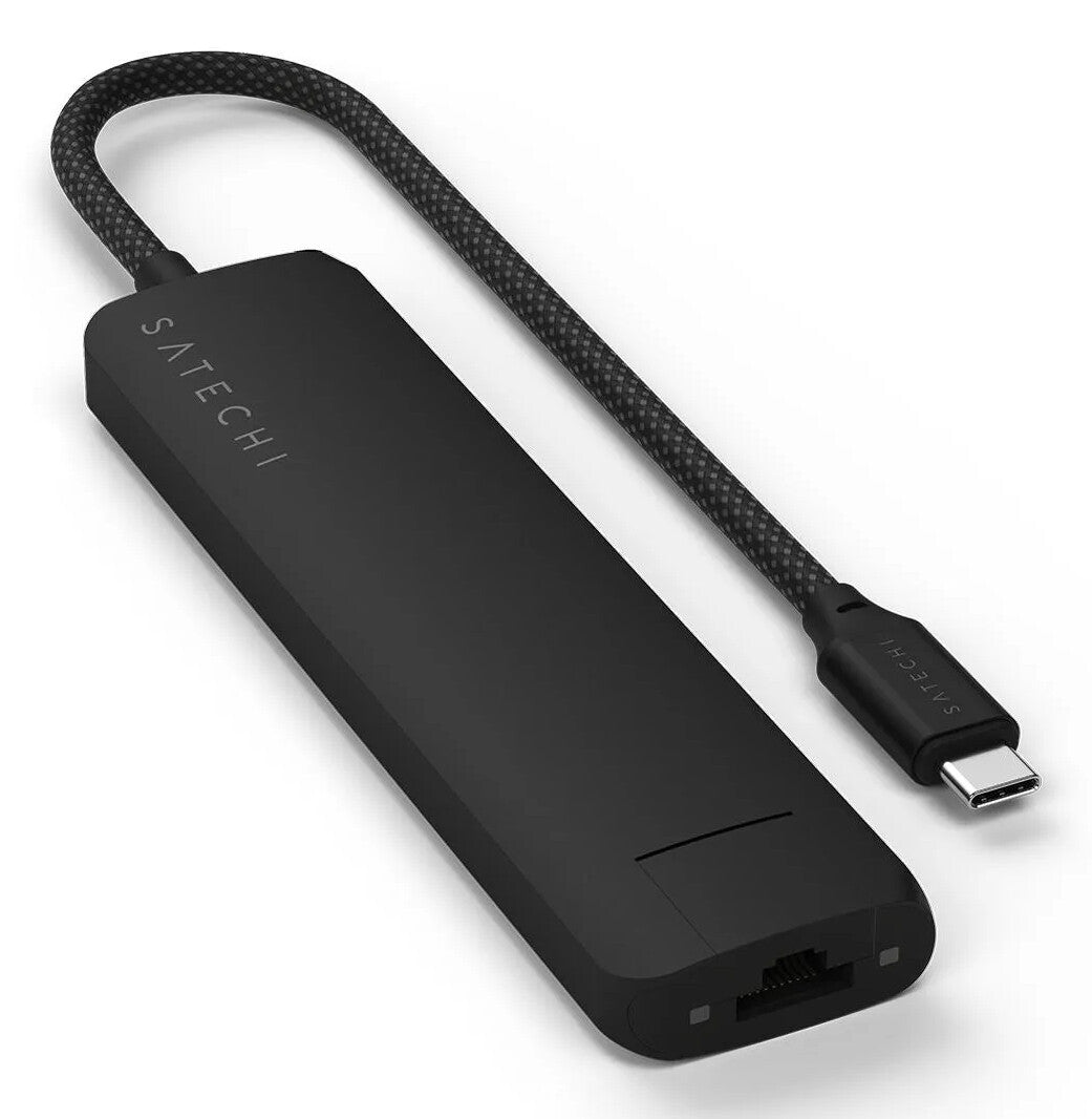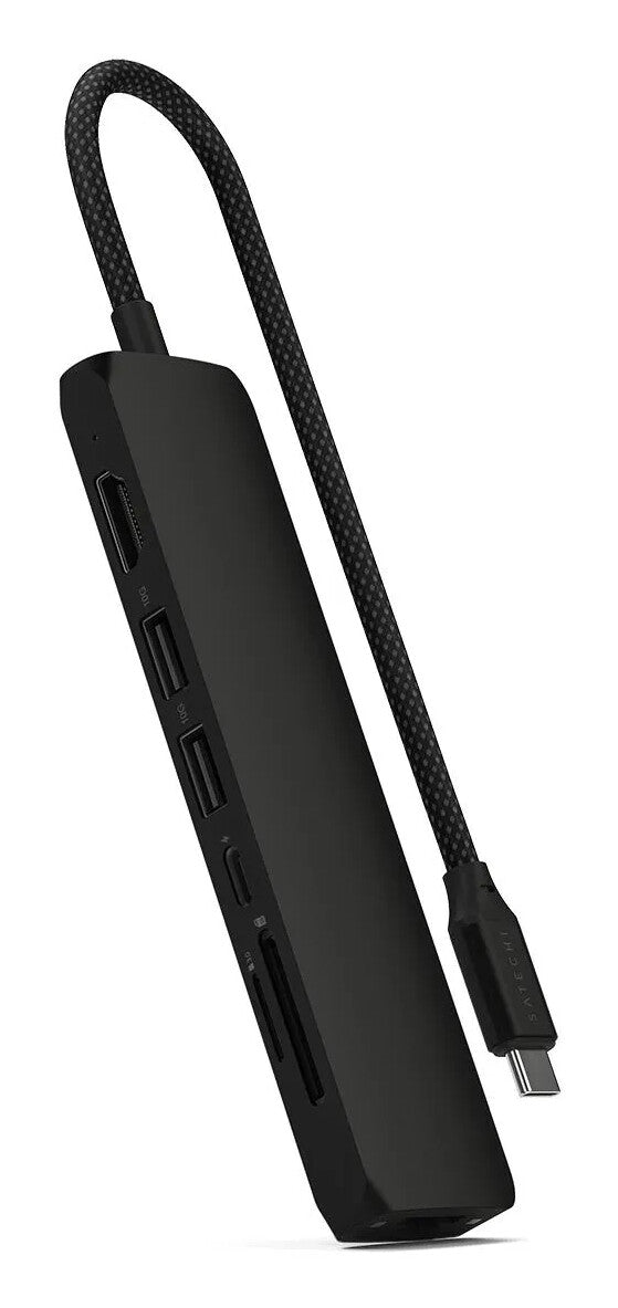 The Satechi 7-in-1 USB-C Slim Multiport Adapter with Ethernet in Black is the ultimate companion for your laptop or tablet. Enhance your device's connectivity with this sleek and versatile adapter, designed to expand your ports and keep you connected wherever you are.