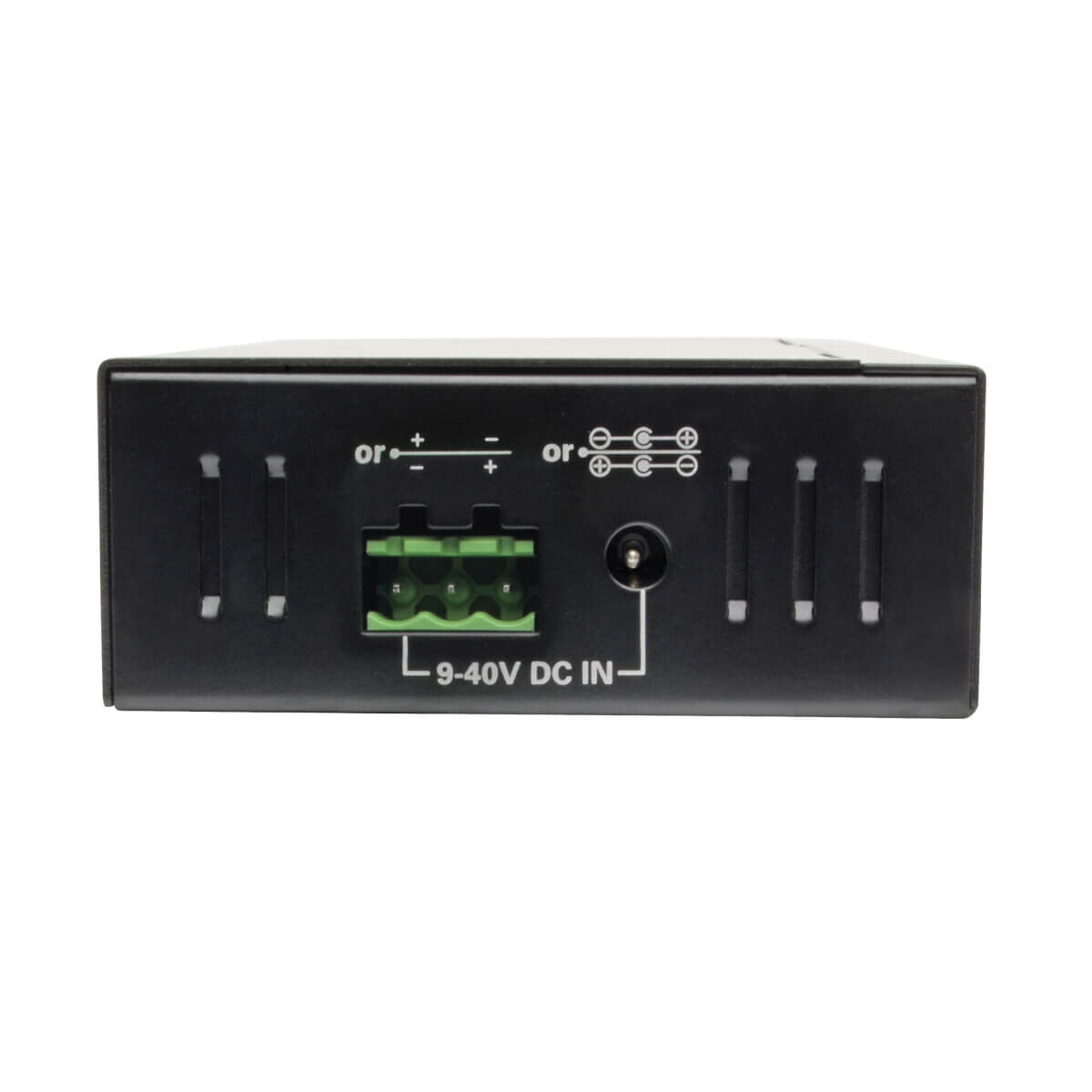 The U360-004-IND requires no software or drivers to download and install. It draws power from the connected computer through the included USB cable. You can also plug the included 3-wire terminal block into the hub to draw power from a power terminal, or connect a compatible 9V–40V DC LPS power supply (not included) to a standard AC outlet. The hub mounts easily to a wall or DIN rail using the included hardware.
