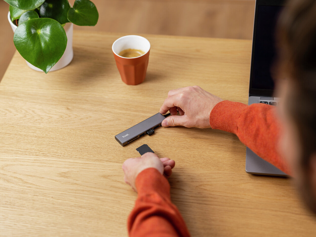 Thanks to the three USB 3.2 (Gen 1) connections of the Trust Halyx, you can easily plug in three different external hard drives. With transfer speeds of up to 5Gbps, it finishes backing up large files before you return to your desk with a fresh coffee. And thanks to the integrated (micro) SD card reader, which supports SD, SDHC and SDXC cards of up to 2TB at a maximum transfer rate of 104MB/s, it’s a great solution for photographers and videographers, too.