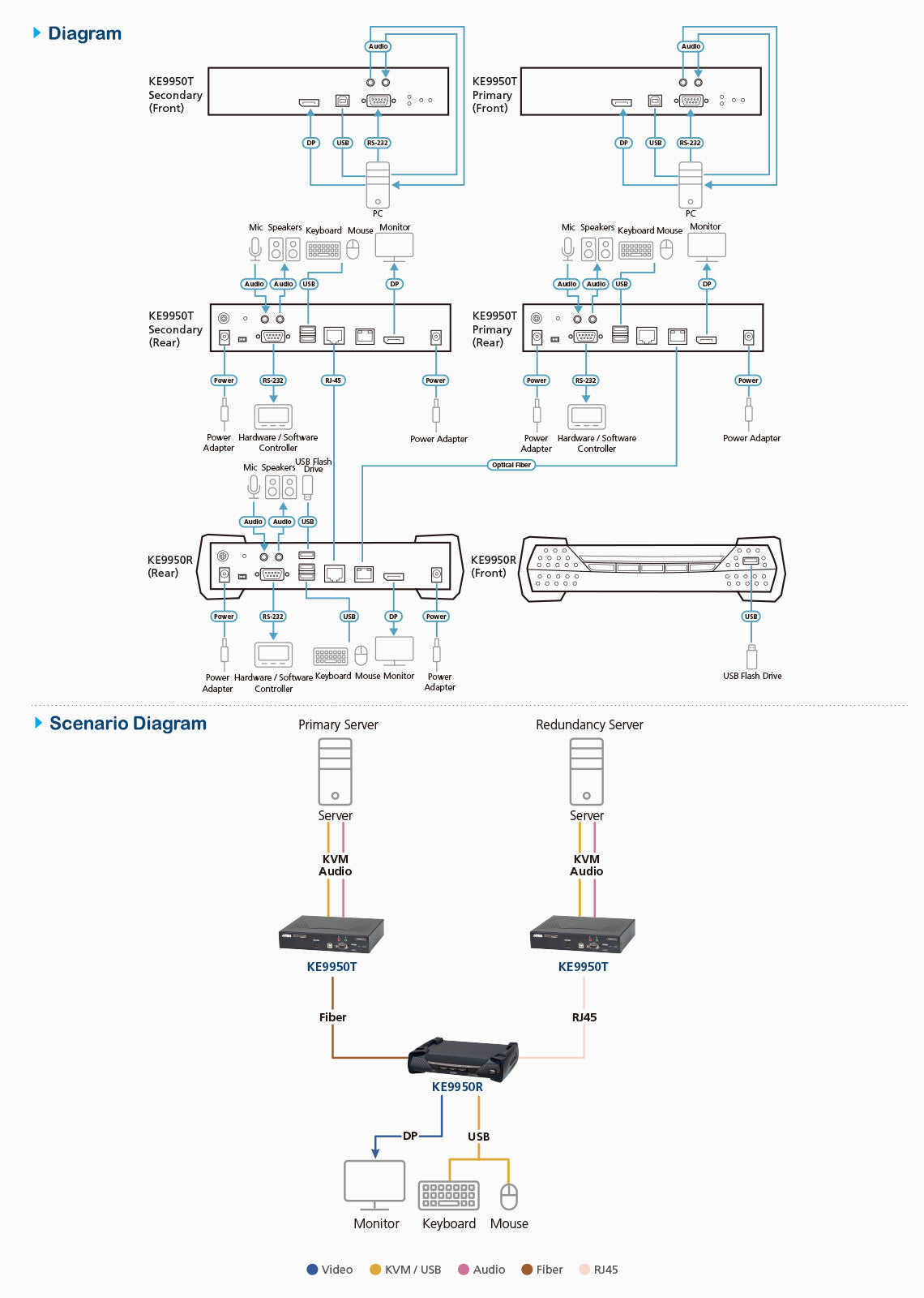 ATEN KE9950 Air Traffic Control Bundle Solution consists of two high performance IP-based transmitters (KE9950T) that connect to two PCs / servers and an IP-based receiver (KE9950R), providing console access from a separate location. The solution builds effortless IP extension that eliminates the distance restrictions of control room management, enabling a faster response to mission-critical data center emergencies. With Primary Secondary Architecture, the KE9950 Air Traffic Control Bundle Solution enables connection to a primary and a secondary computers that allows instant system failover via hotkey switching without moving around workstations. The deployment of ATEN KE9950 Air Traffic Control Bundle Solution allows access to a computer system from a remote USB DisplayPort console (USB keyboard / mouse and DisplayPort monitor) over the intranet, allowing the computer to be located in a secure and temperature controlled environment, which is also isolated from the user workstation.